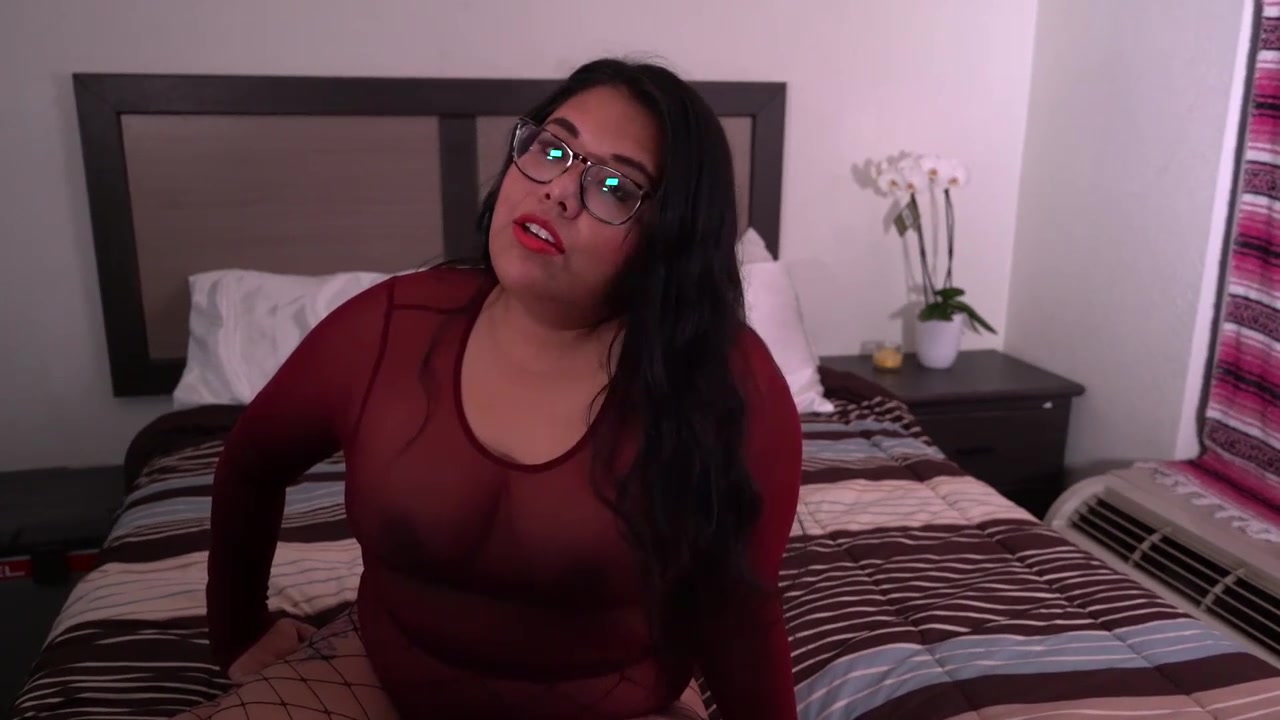 Brown-Haired plus-size with glasses is dressed in fishnets during a live Jerk Off Instructions sesh from her apartment