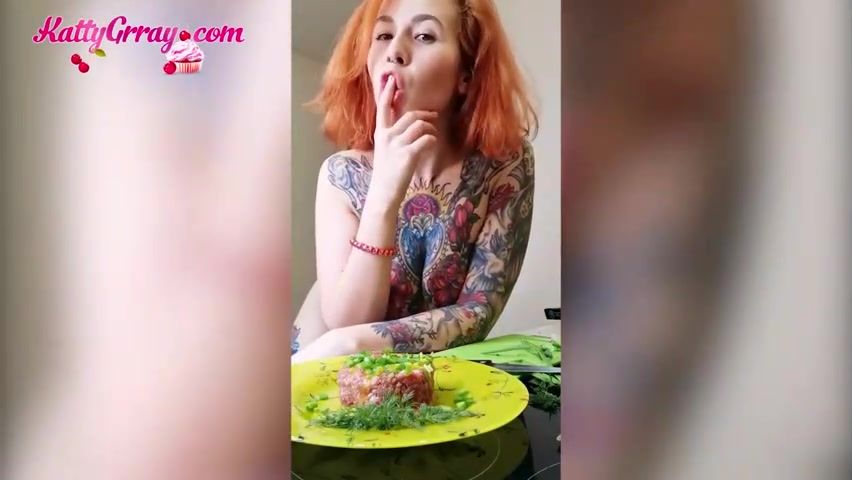 Crimson haired honey with ample bumpers and tats is about to begin petting herself in the kitchen
