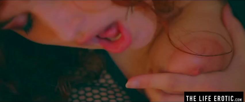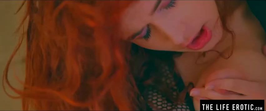 Crimson haied stunner is opening up her gams broad open and stroking with a hair brush