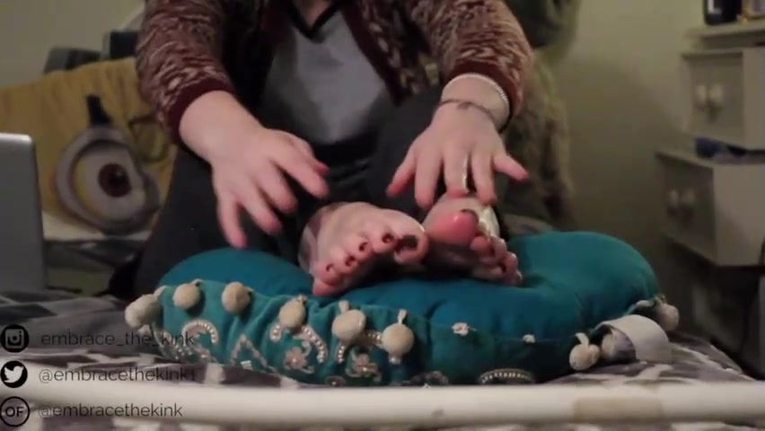 Teenager black-haired loves to lube up her feet and show them in front of the camera
