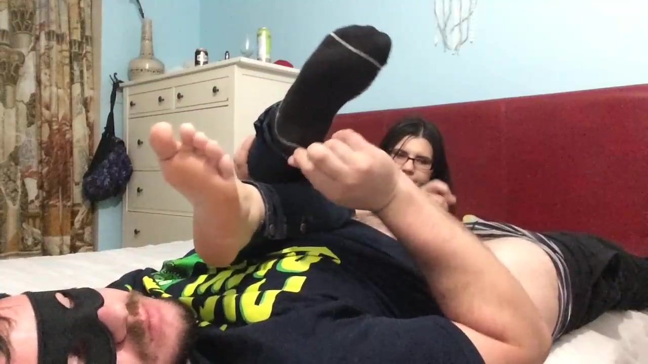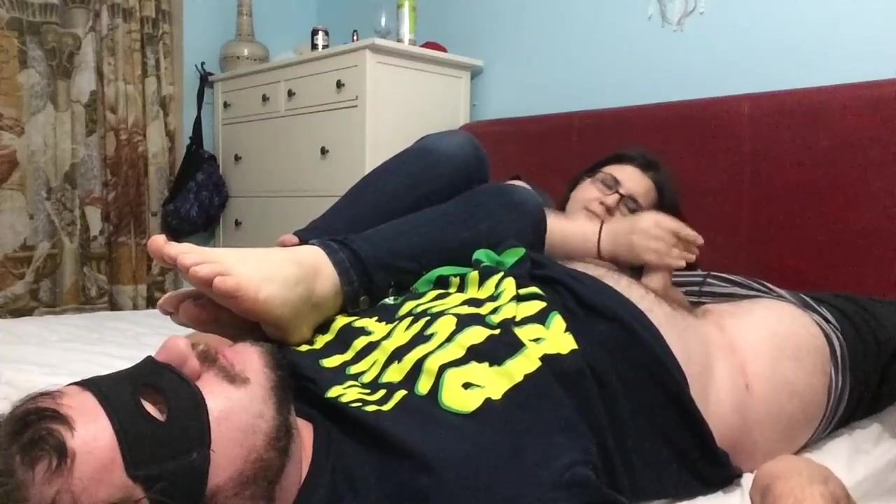 Super-Naughty honey with glasses enjoys to get her soles slurped while providing a hand-job to her stud