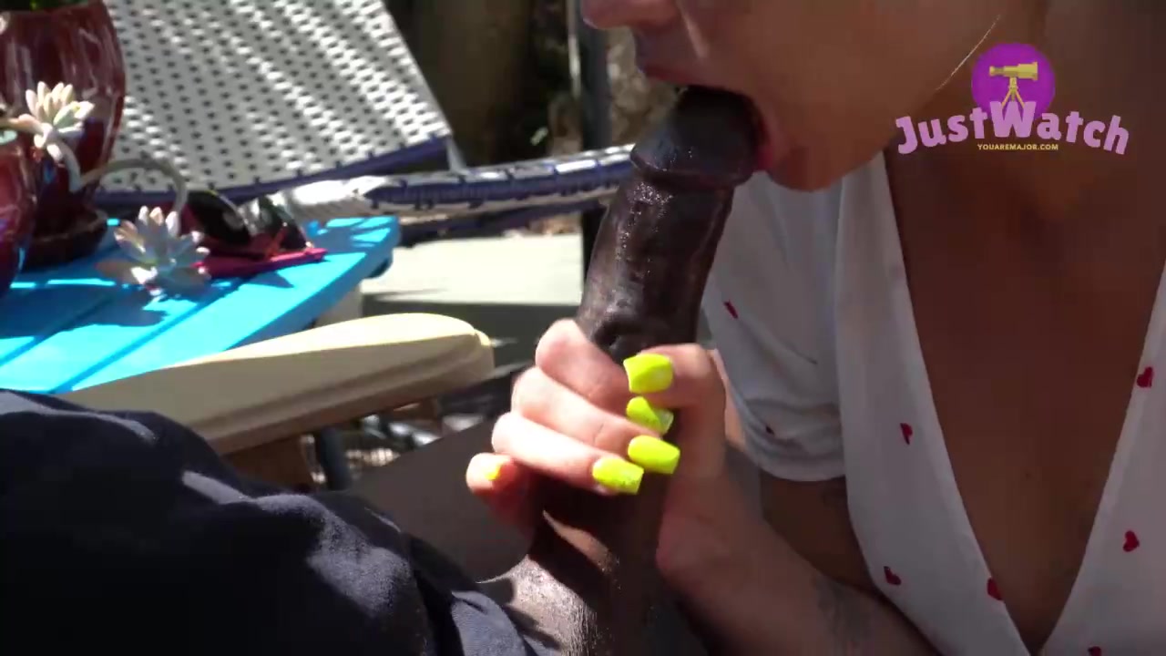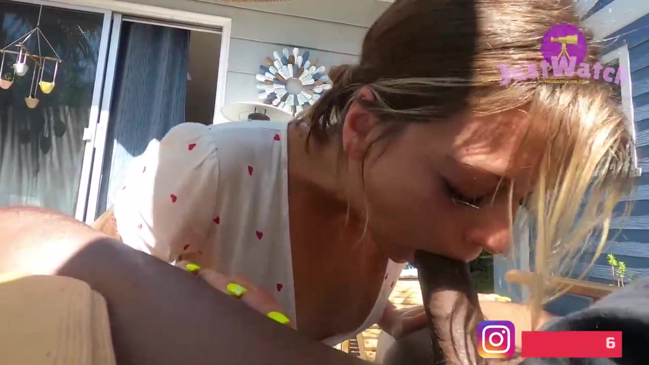 Pipe luving blond is providing a deep fellatio to a insane, black stud, in the backyard