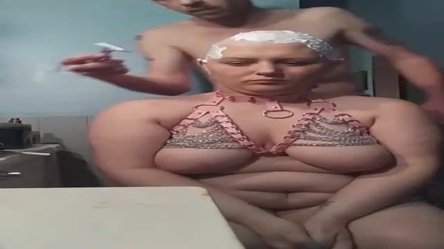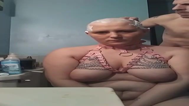 Lush female with monstrous globes is getting her head shaven in front of the camera