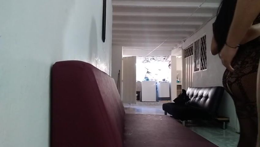 Whorey brown-haired is dressed in a black bodystocking while getting penetrated from the back, in her apartment