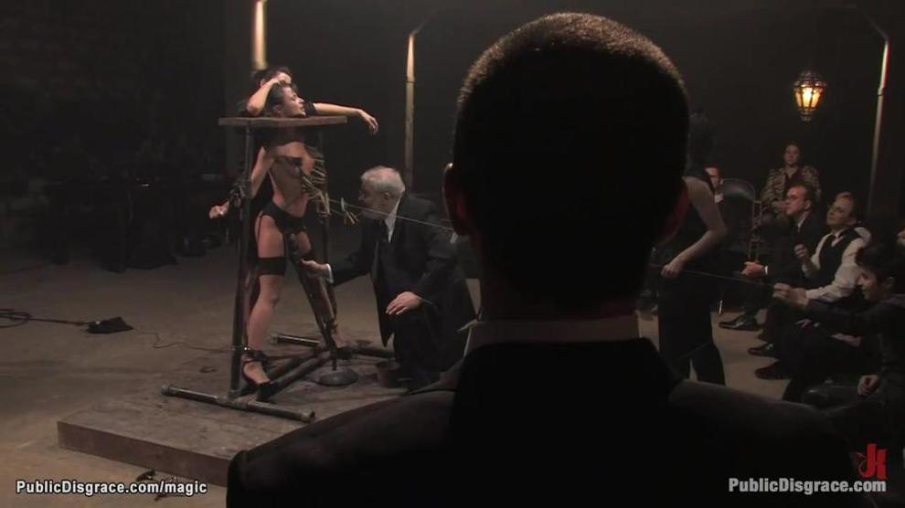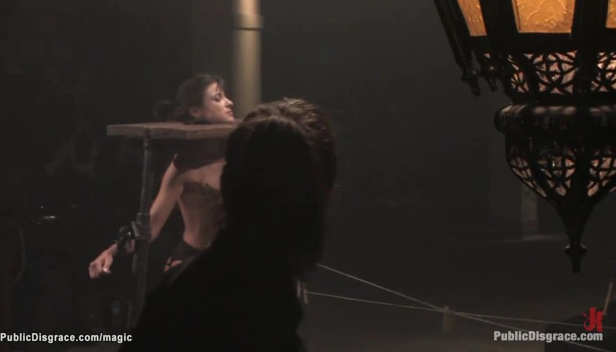 Locked in neck stock and zippered dark-haired French gimp Cecilia Vega is mounted on electro-hitachi then hung in inverted posture throat ravaged in public by John Strenuous