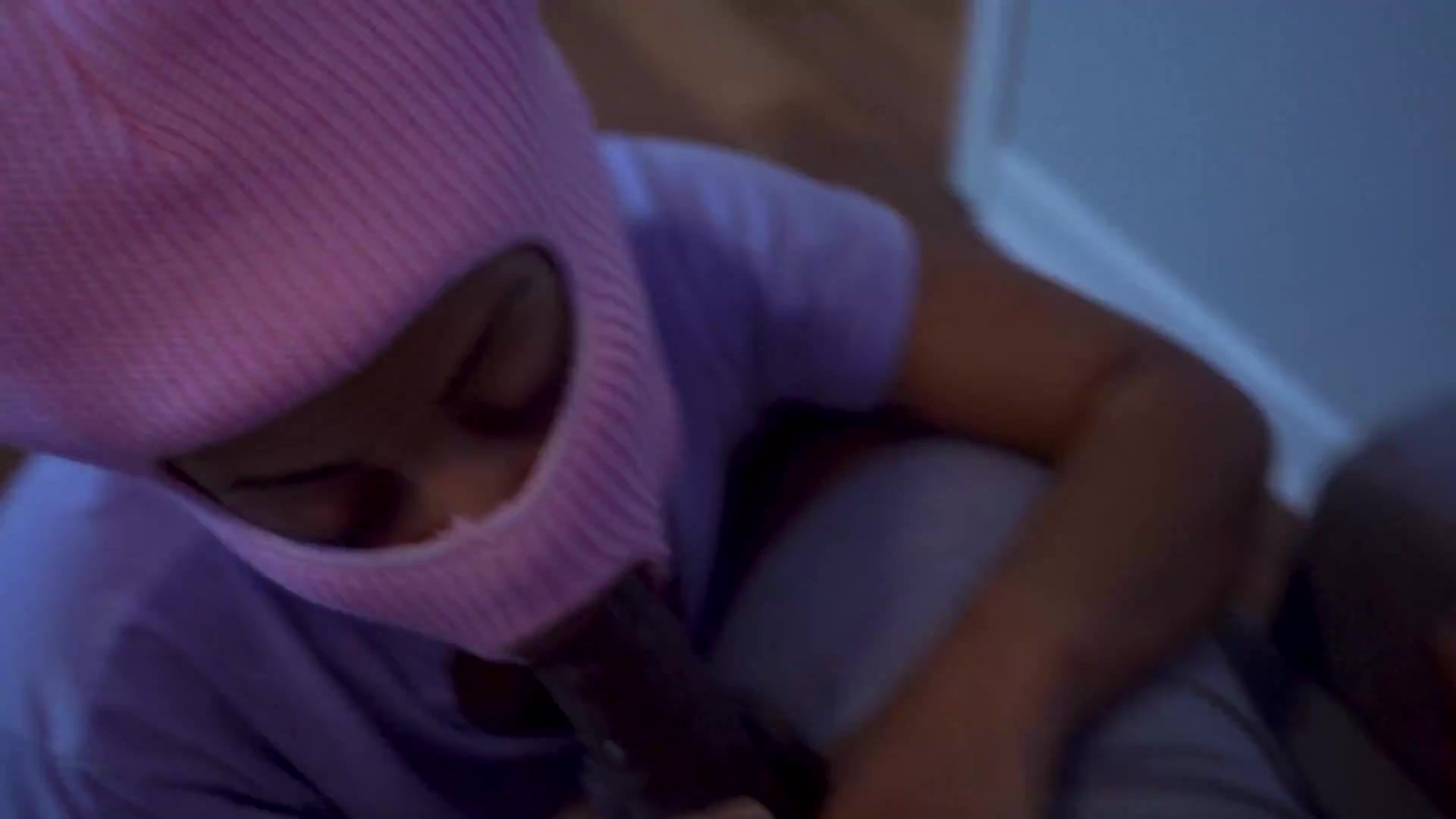 Black mask on her head doesn’t bother her while she milks and gargles his long man sausage