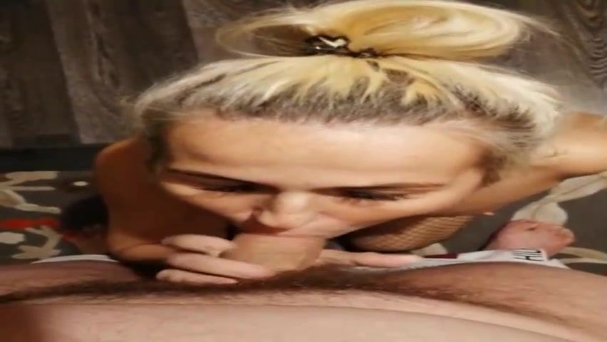 Outstanding light-haired girl with petite knockers is dressed in black fishnets while draining and deep-throating rod
