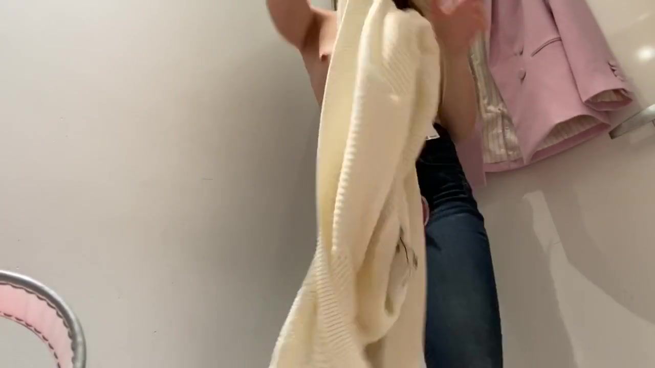 Slender doll is attempting on various trousers in front of a covert camera, in the dressing guest room