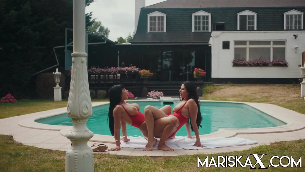 Valentina Ricci and Mariska are tonguing each other up next to the swimming pool, during the day