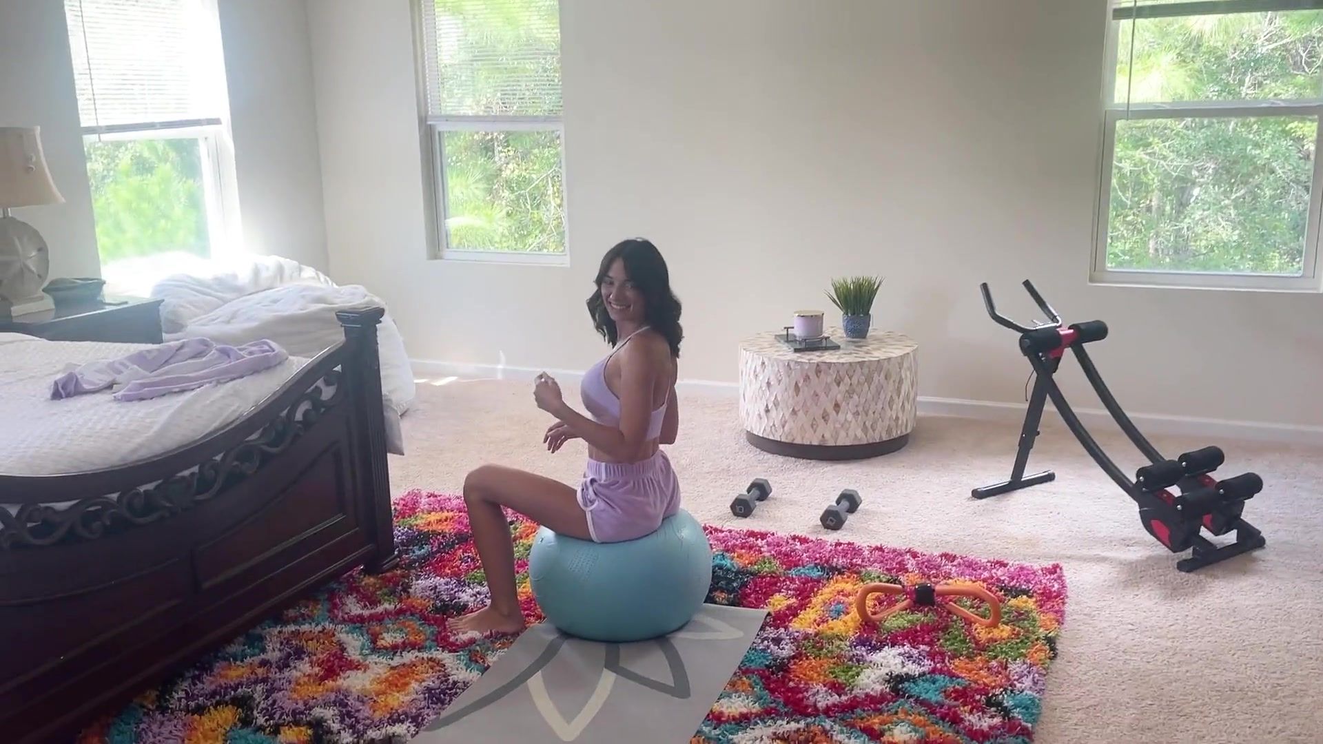 Fapping spunk-pump on workout ball during Yoga