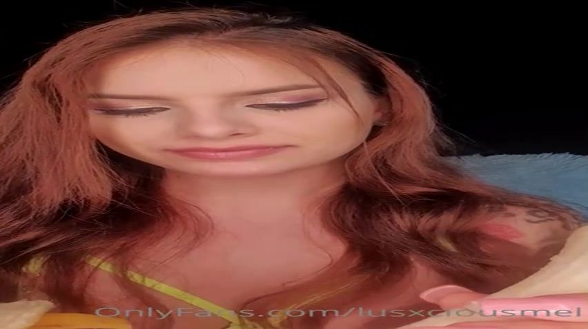Inked red-haired is tonguing a banana while braless and softly squashing her mounds, just for joy