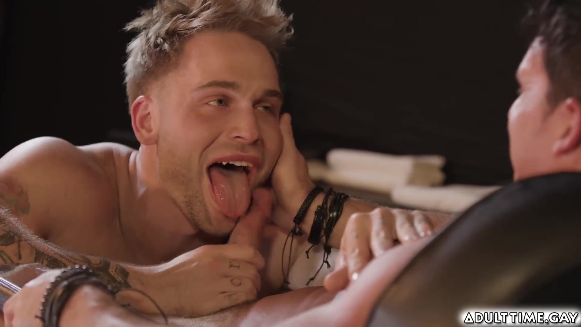 Trent Marx and his wife enter the barber's room. The barber, Reese Rideout, checks Trent out. Reese gives wife towel to relax and put over her eyes as she sits down in the background. Reese then give his customer a blowjob and fuck him while wife is relaxing