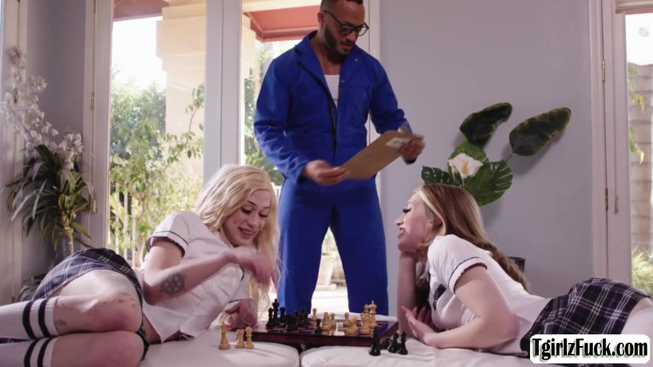 Blonde transsexuals Jenna Gargles and Izzy Wilde are playing when hunk black technician arrives to repair something. The two are amazed and flirt with him until they share his big black cock up their mouth to deepthroat blowjob and interracial anal threesome.