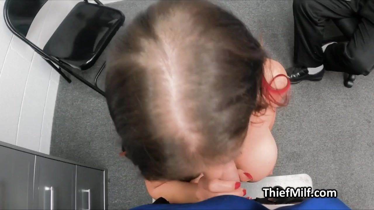 The unexpected happened. This slutty mature gets sent into the backoffice for questioning and her ex husband shows up to ride her pussy in threeway!