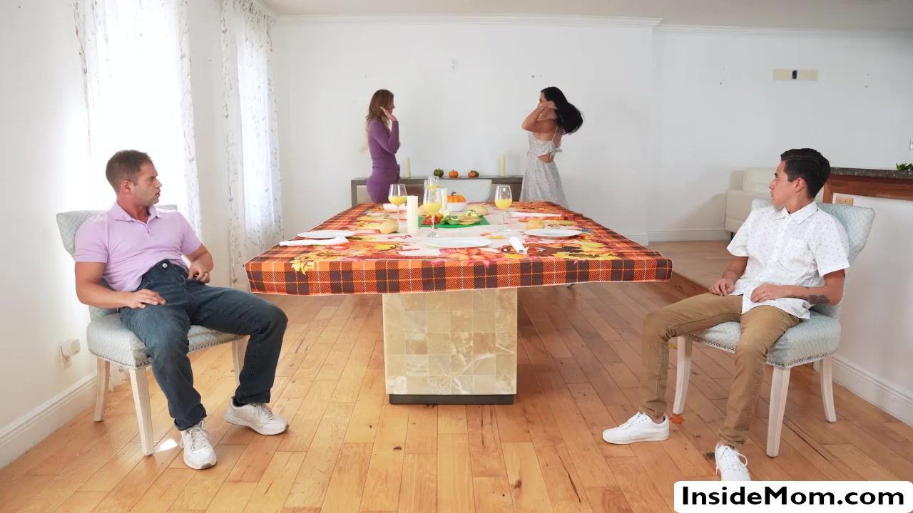 Lolly Dames and Sandy Love are celebrating Thanksgiving together with their stepsons Nicky Rebel and Juan El Caballo but they made it more fun with a hardcore foursome in the kitchen. They share deepthroat blowjob and the two fucks their milf pussy doggystyle.
