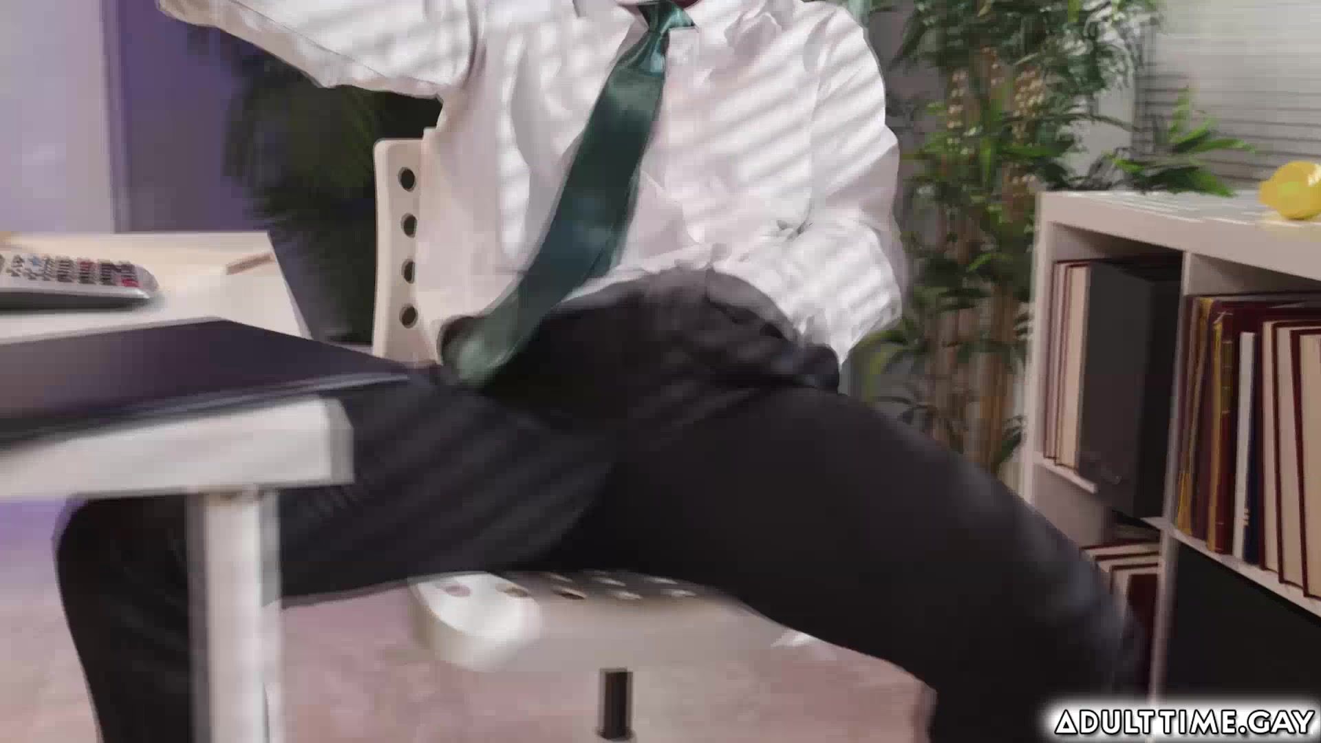 Jkab Ethan Dale keeps checking on his boss Dakota Payne. Jkab puts on the goggles and starts checking Dakota seeing right through his suit! he notices a purple butt plug out of his asshole. Dakota soon discovers what Jkab's up to, and decides to teach him a lesson a threesome, with their big boss.