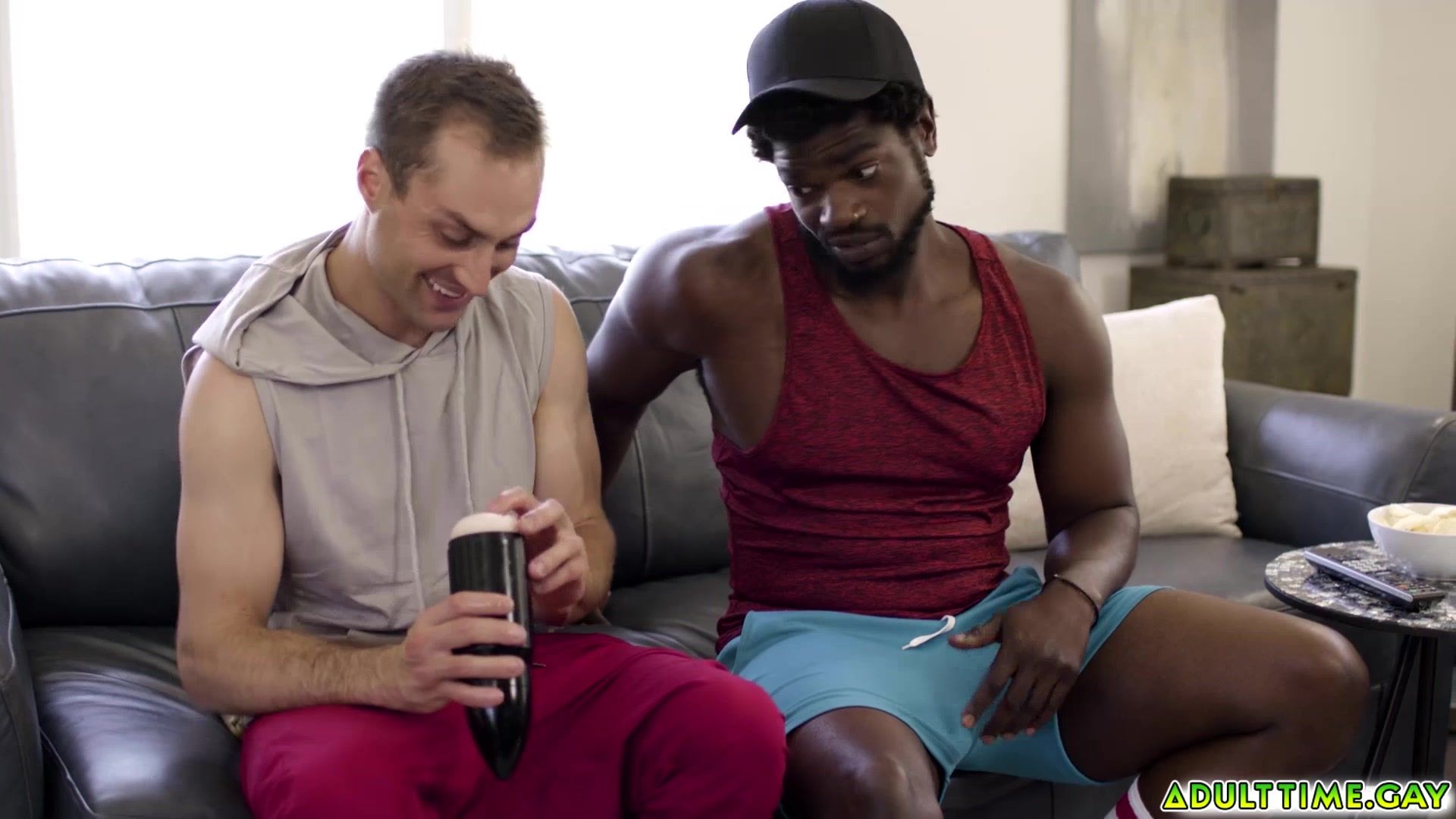 Devin finds himself unexpectedly aroused by the sight of Damien jerking off with the toy and asks if he can have a turn The two guys take turns using the toy to jerk off until they both get so turned on that they find excuses to take things further