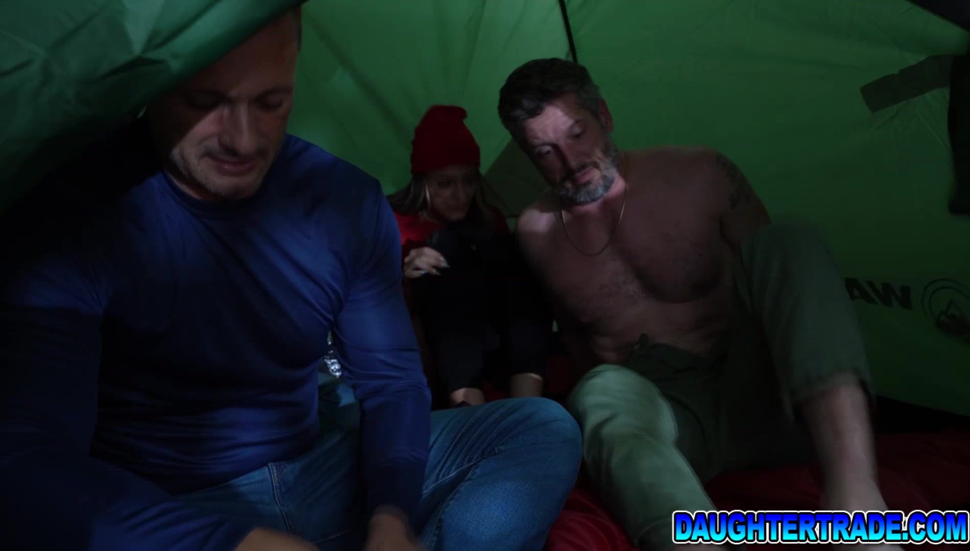 Naughty teen shared by two dicks during a camping trip