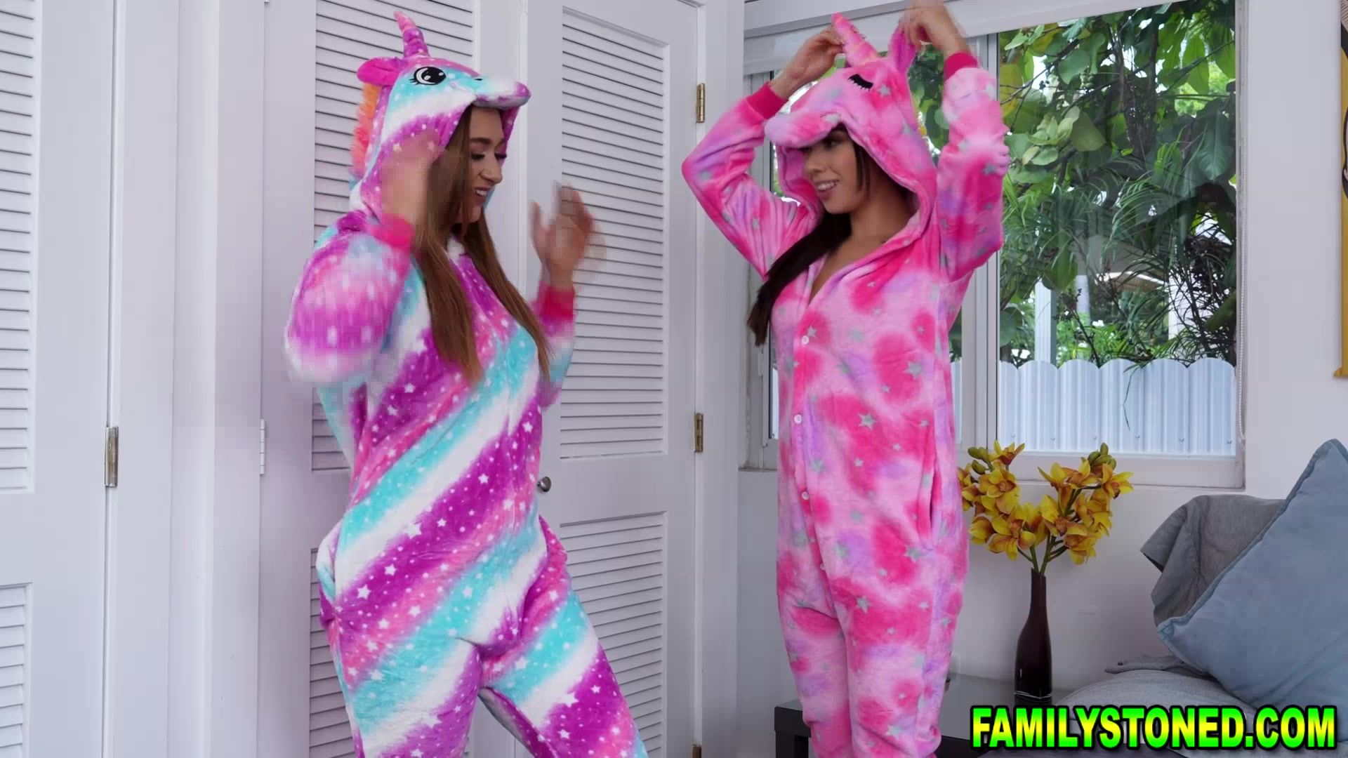 Callie and Gaby overhear their stepbrother Nicky talking about a college party involving unicorns they get their unicorn onesies on and go talk to him about bringing them to the party but before that they start making out in bed first licking pusies