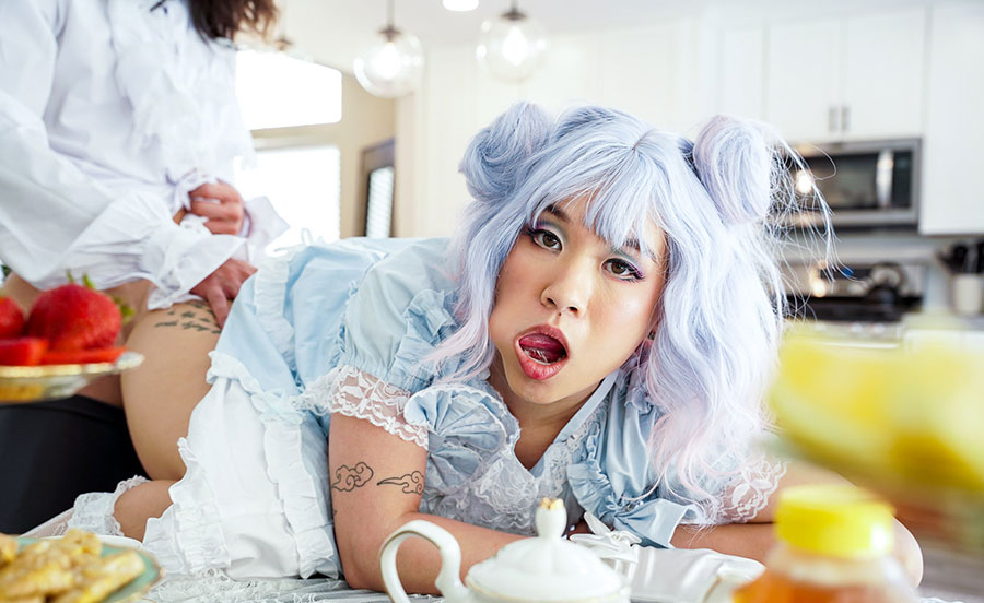 In the kitchen, petite stunning asian teen Kimmy Kim had a dinner with hunk guy David Lee where he eagerly taste the treat between her legs with a luscious pussy licking. The horny babe then grabs his bigcock to blowjob before she enjoys a hardcore pussy fuck.