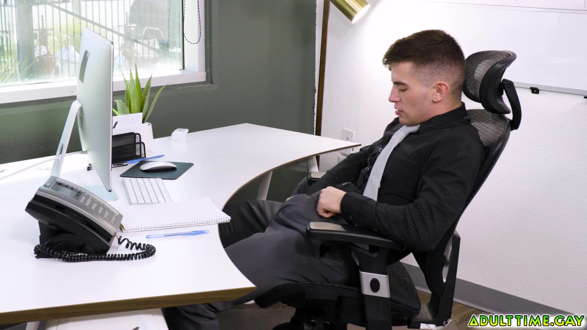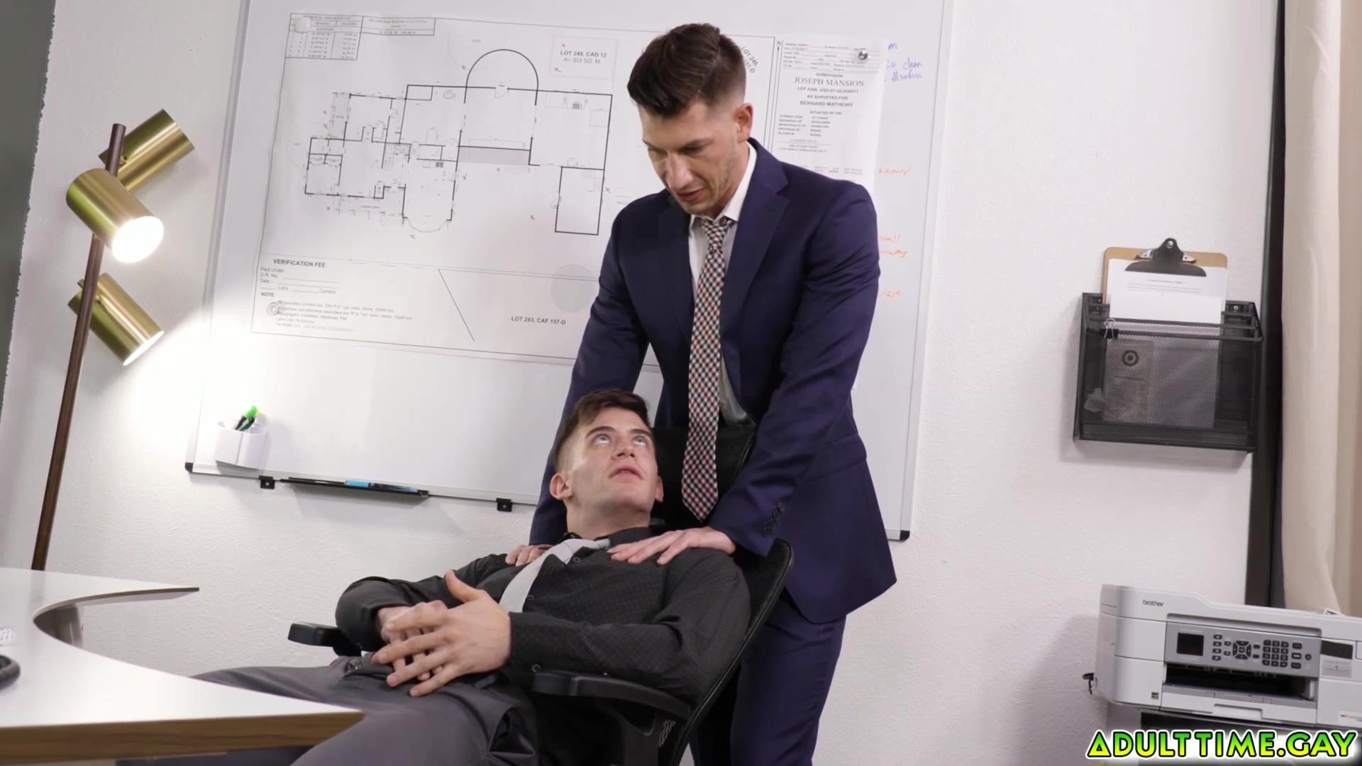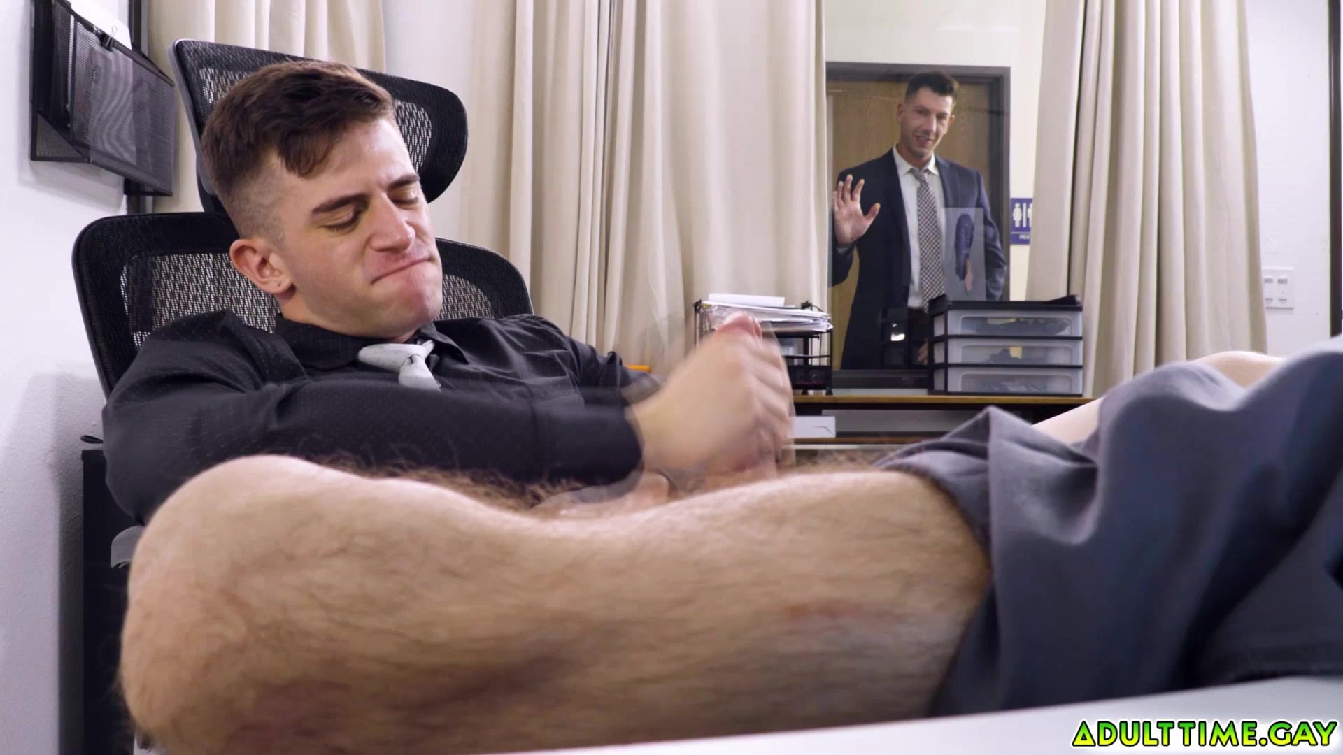 Trevor Brooks is hard at work in the office Seeing an opportunity to steal somealone time to alleviate a bit of stress he goes for it pulling his cock out for a little rub Not long after his boss Jordan Starr happens by and catches him