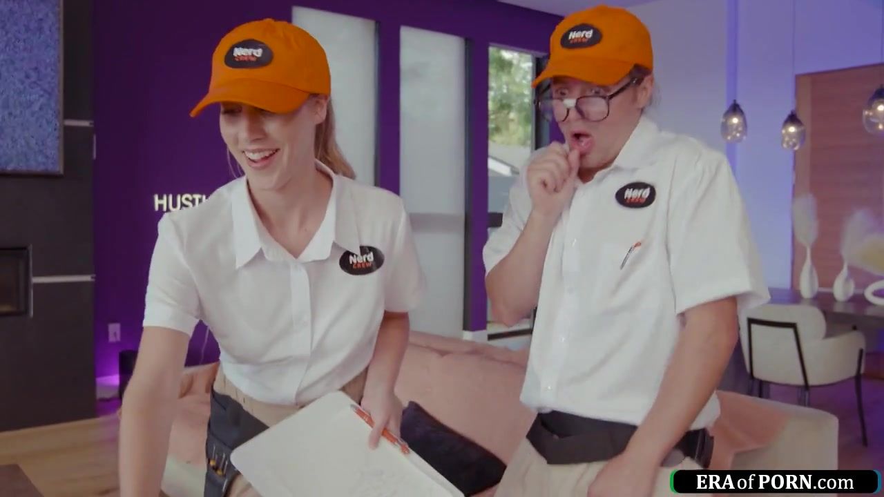 Girl licked and fucked by 2 technicians