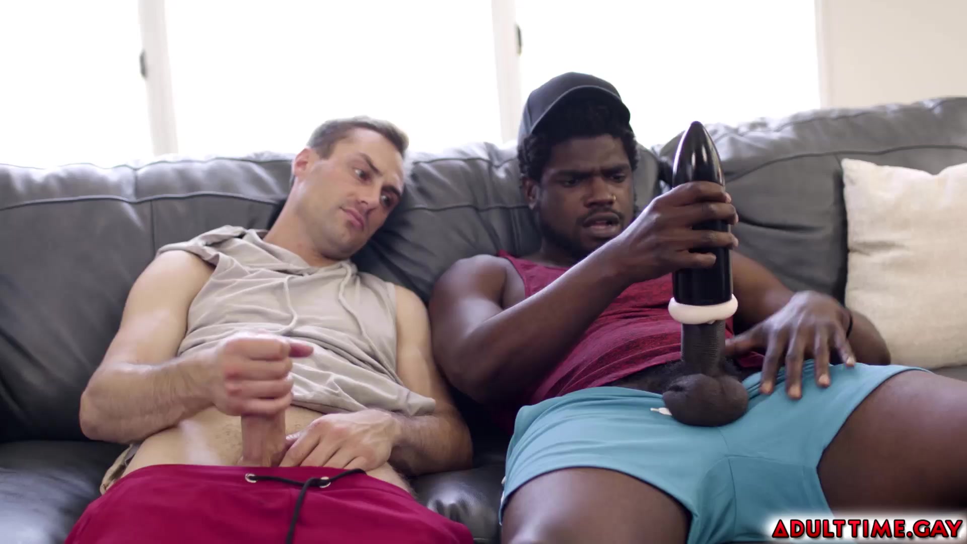 Straight best friends Devin Trez and Damien White plays with their dick with a fleshlight. Devin gets aroused watching his friend jerking off with his toy. They eventually started fucking and Damien is having a hard time taking Devin's massive black dick.