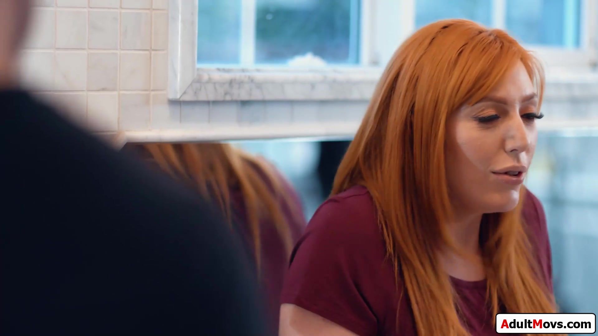 Busty redhead stepmom sits next to her stepson without pants on.The milf wants to make it up to him and takes him to her bedroom to let him suck her boobs.In a 69 shes licked while tityfucking and deepthroating.She then rides him with her hairy pussy
