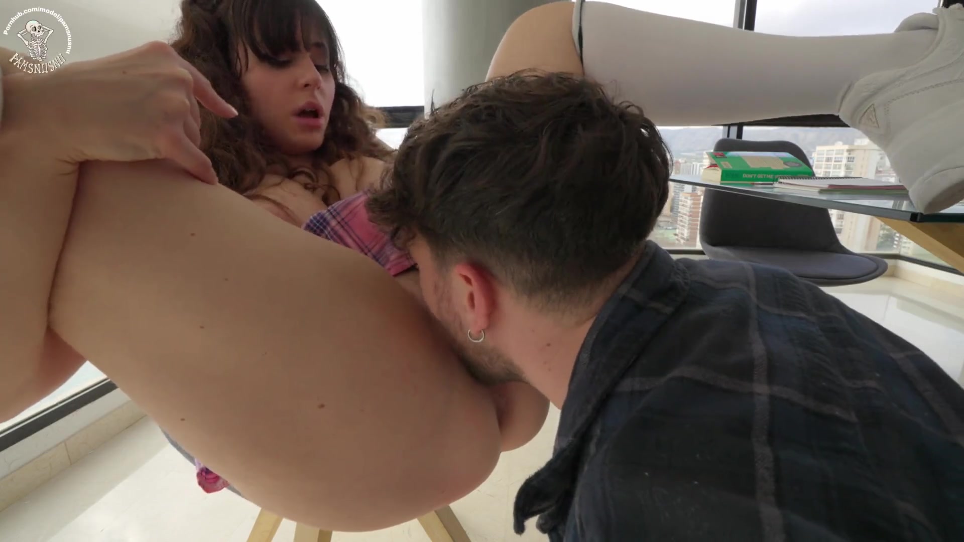 Brunette femdom licks and pegs subjects asshole