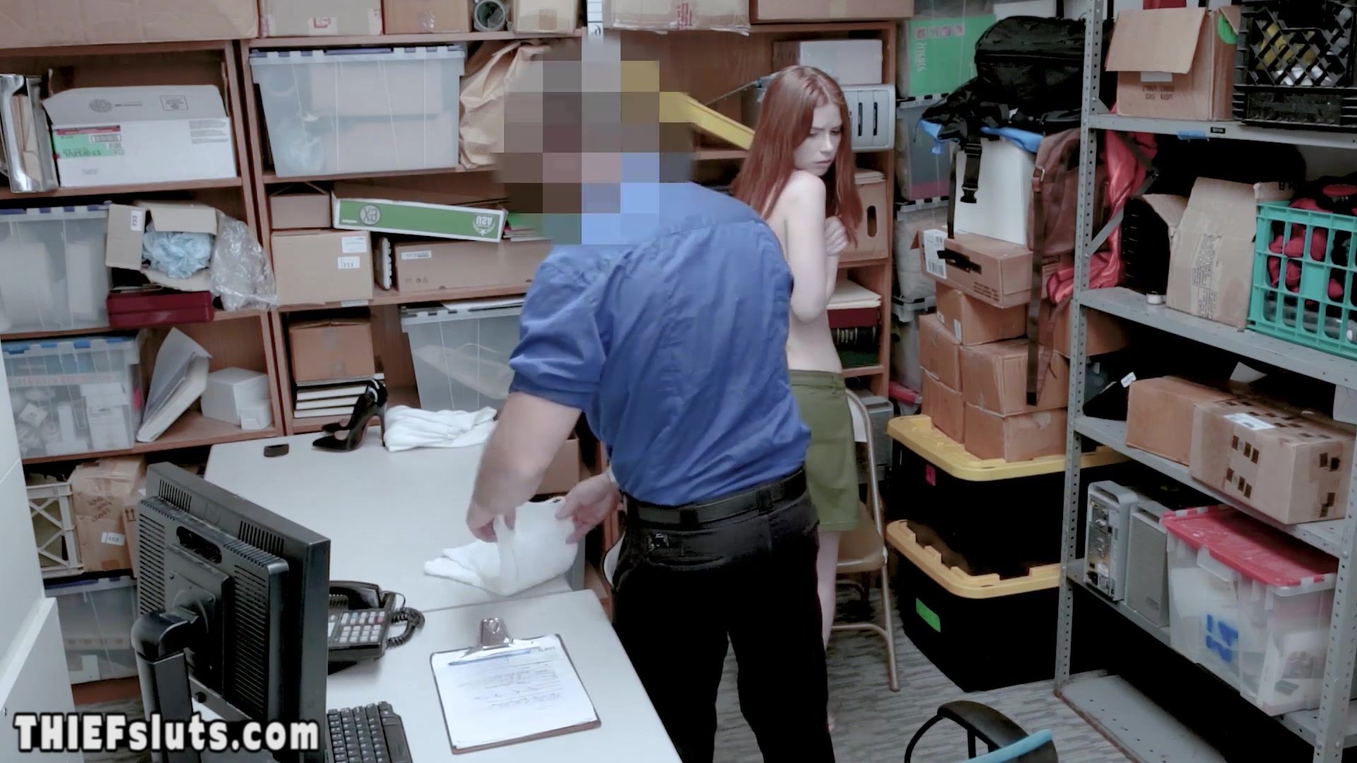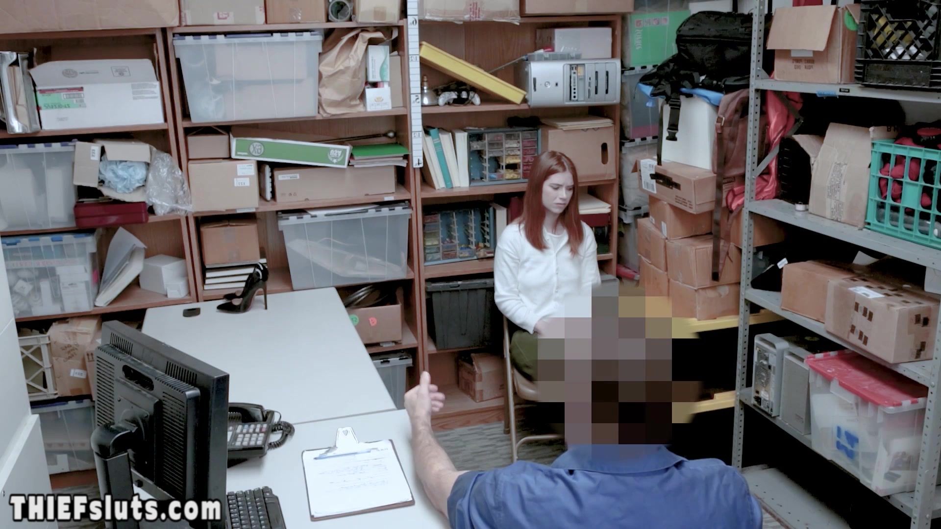 Scared redhead teen thief Pepper Hart with small tits gets caught and interrogated by a LP officer who wants her pussy and a blowjob exchange her freedom She takes his big dick and tasting it the he is fucking her hard