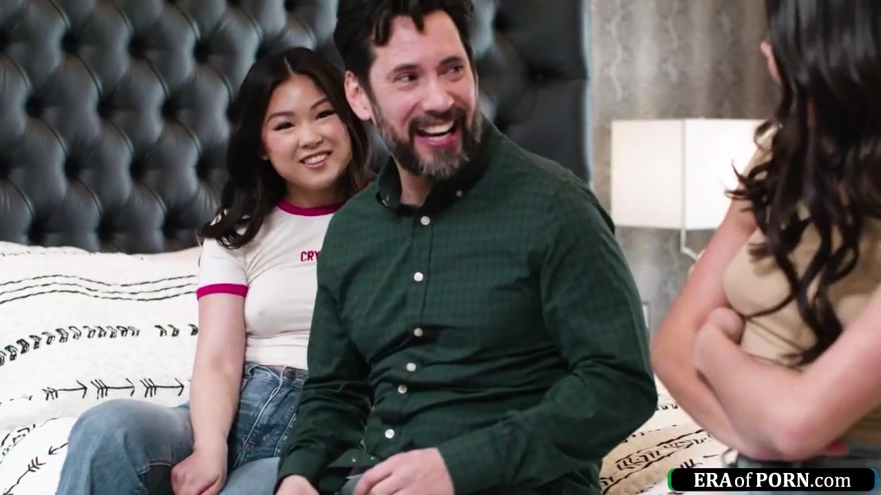 Asian babe and petite bff find out they have the same boyfriend and punish him with a 3some.They deepthroat his big cock and sixtynine as a small tits brunette gives him a footjob.Then the older man fucks her as she licks the asian girl hairy pussy