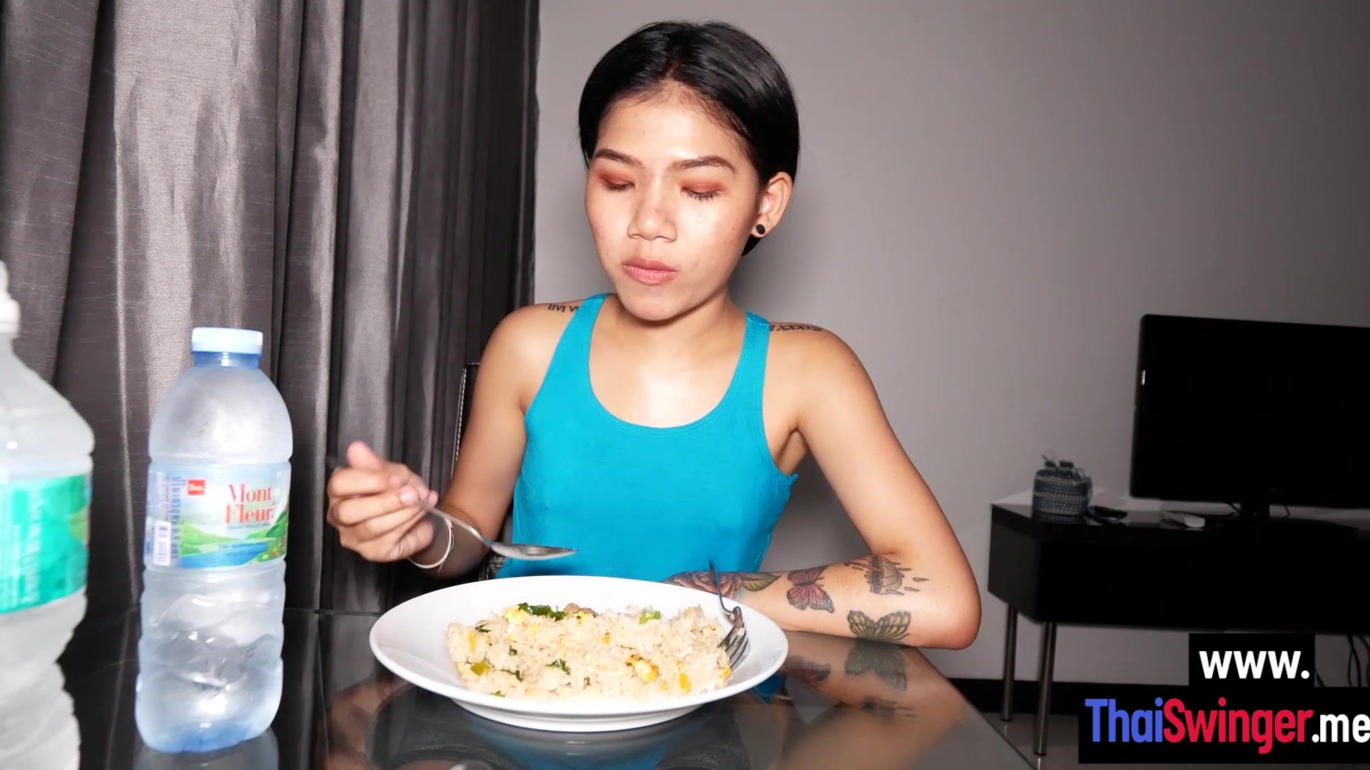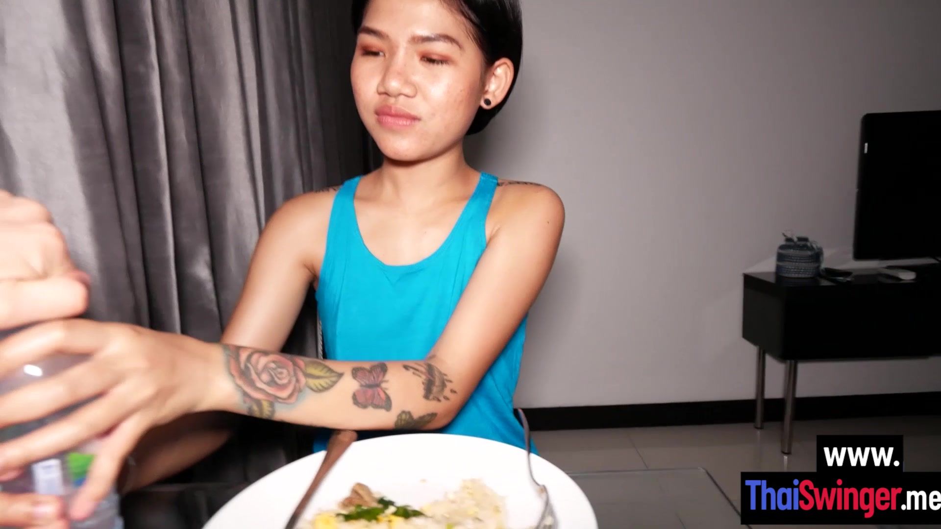 Rough fuck with wet petite small tits Asian teen girlfriend after she swallowed guys big cock and massaged it Petite Thai teen wanted cock so she sucked it After amateur blowjob petite teen enjoyed hardcore pussy fucking