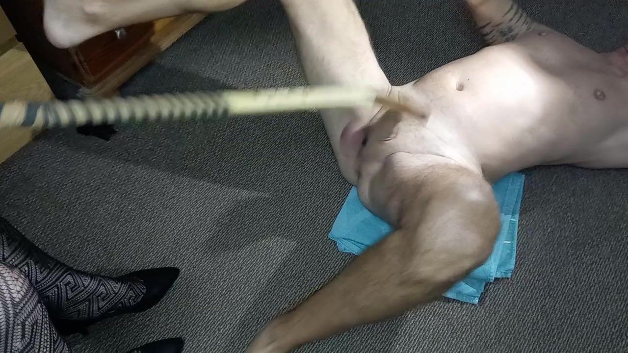 Madame in wild tights stands on testicles in healed shoes