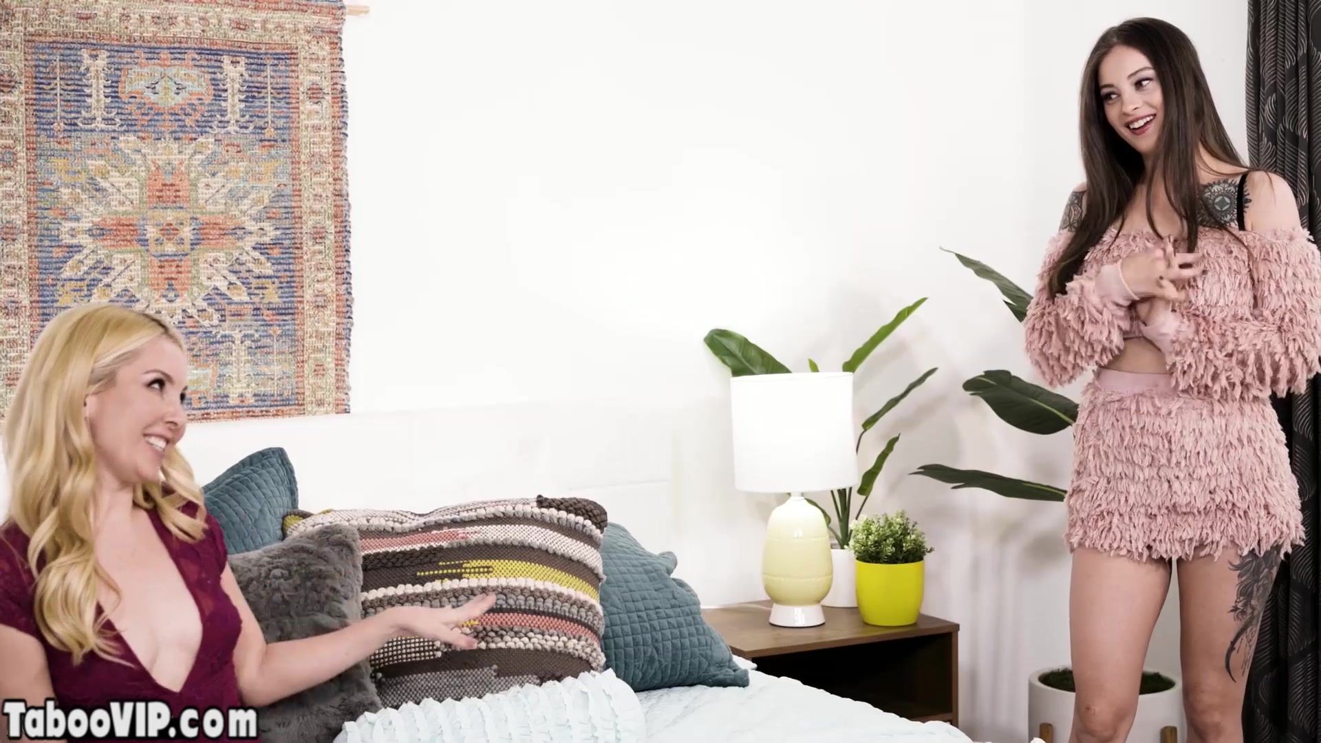 Lesbian blonde MILF stepmother wants to spend some quality time with her hot brunette stepdaughter with big boobs and peierced nipples before she joins to the military So she lure her into lesbian sex and she is eating her fresh pussy