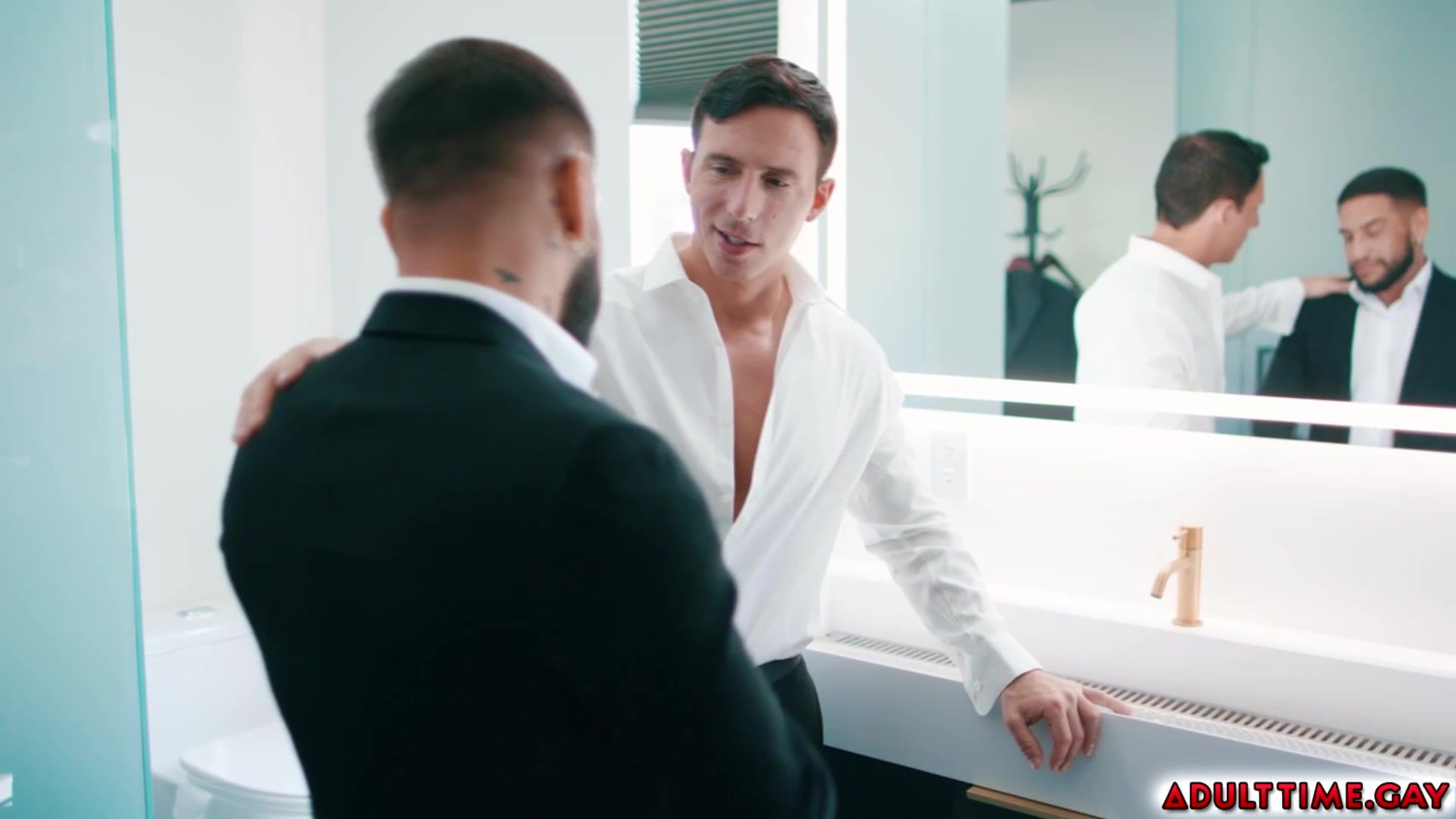 Gay groom Brock Banks gets cold feet on his wedding day and gets to be comforted by his straight best man, Reese Rideout. Reese admits his feeling for Brock and soon engages in steamy sex with him in the bathroom almost getting caught.