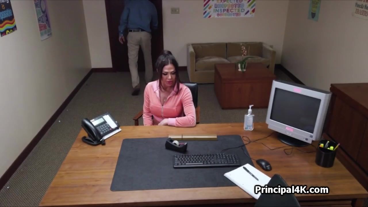 Seems like she knows whats coming next. Its time to show off her amazing big round boobies and get on principals big fat dick.. right at the office!