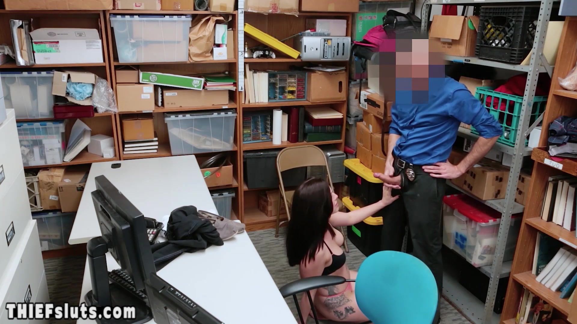 LP officer brings a hot brunette teen thief Raven Reign with perfect natural tits to his office and after the interrogation he orders her to suck his throbbing cock then he is fucking her shaved pussy roughly