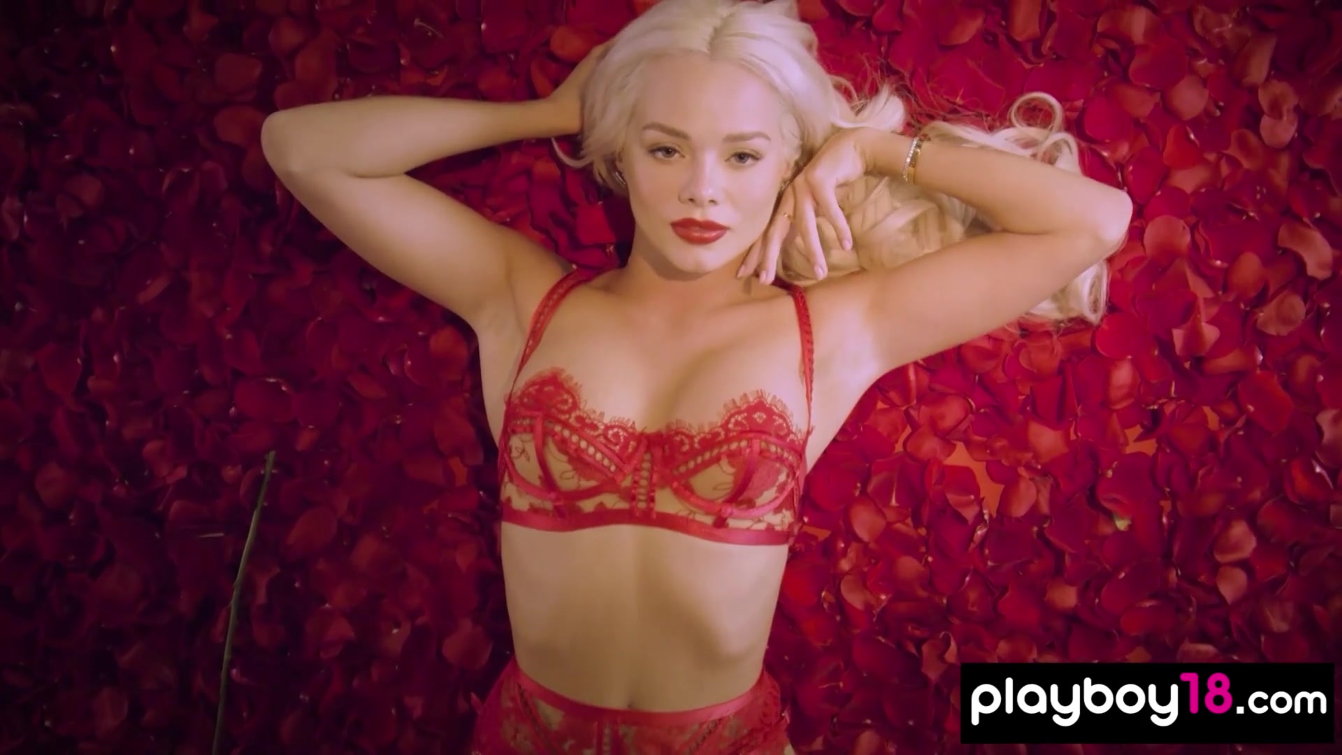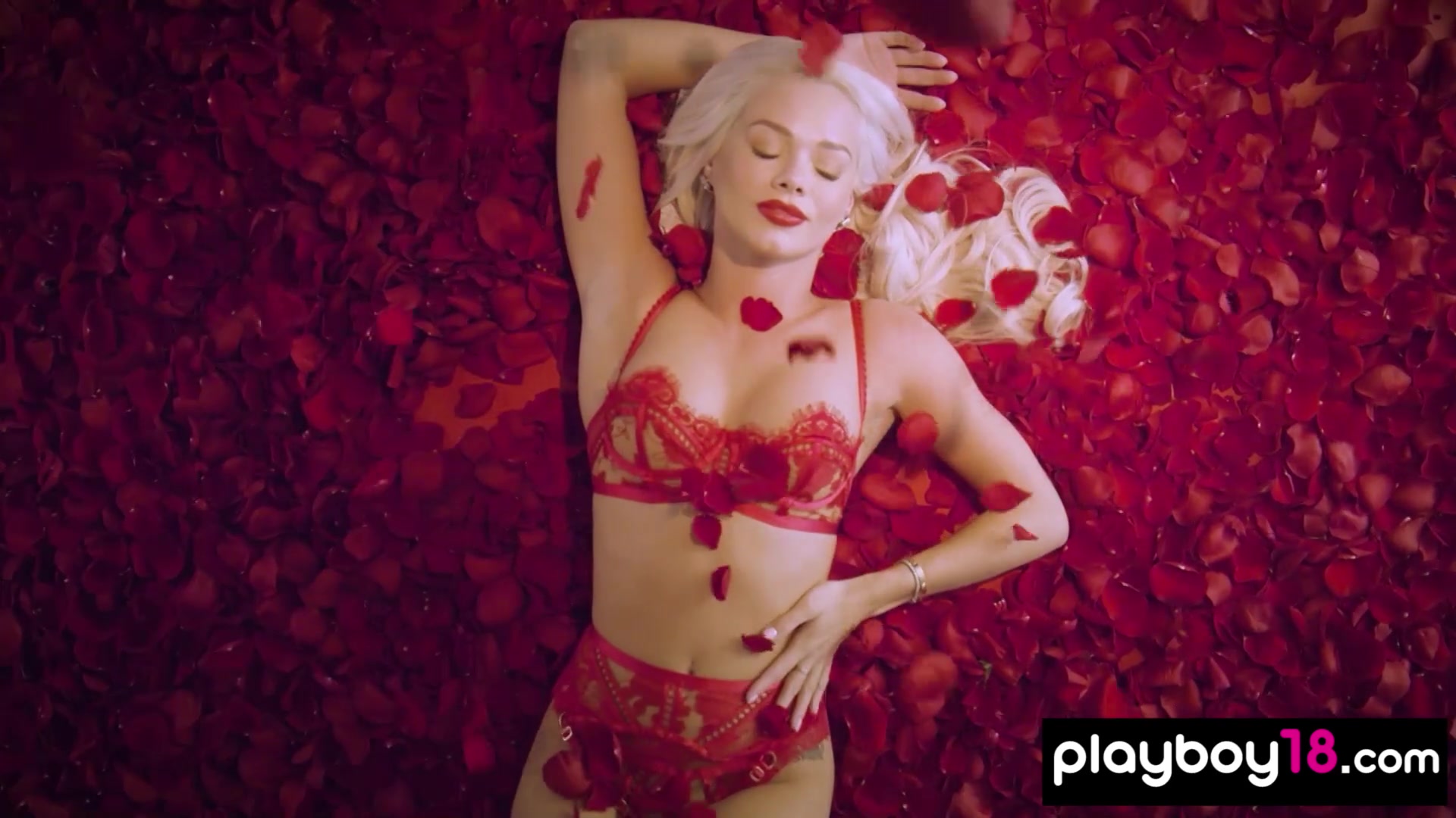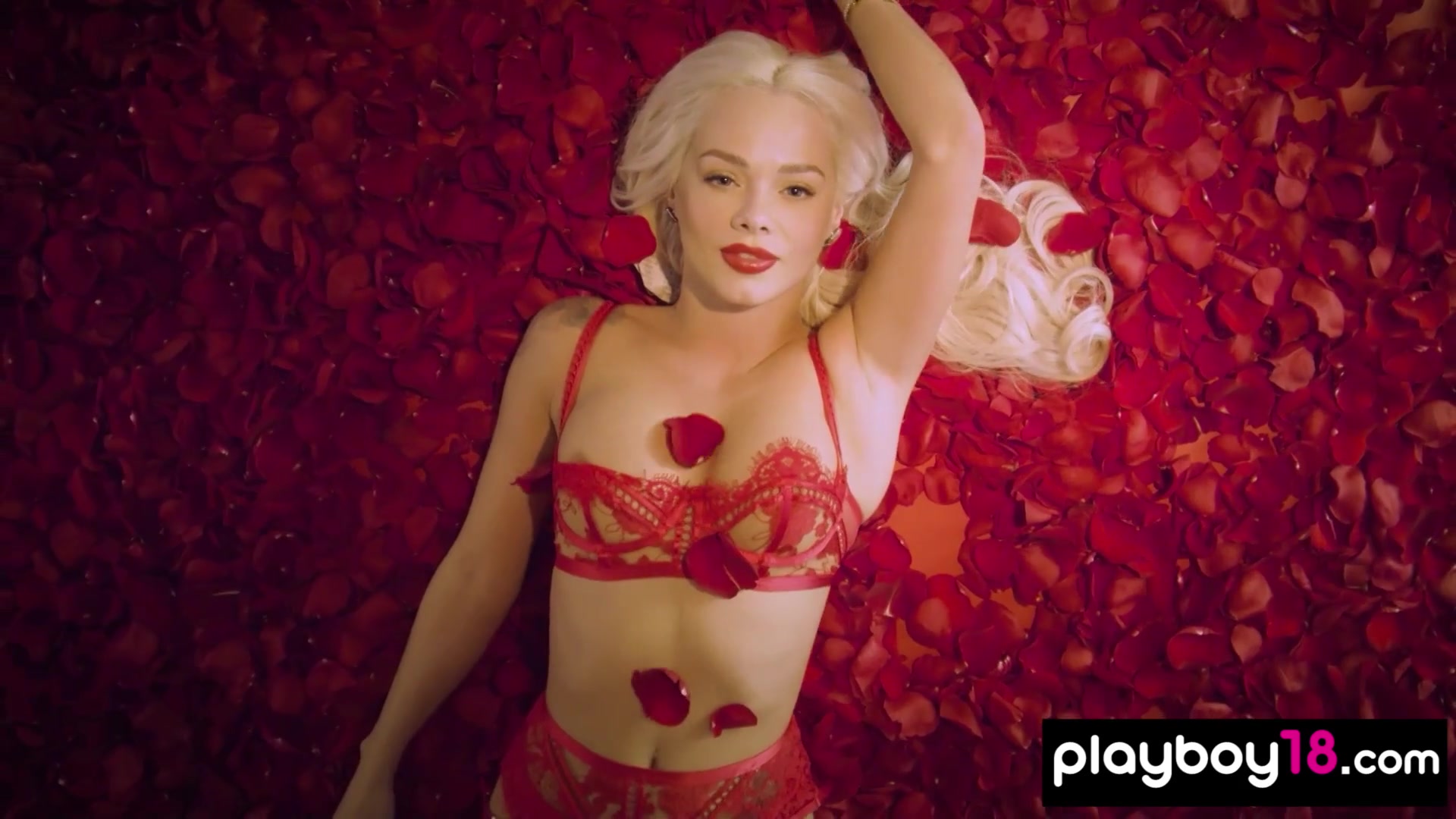 Petite all natural blonde beauty Elsa Jean with perfect boobs is teasing in her fancy red lingerie She is taking off her bra and panties slowly then the sexy naked babe is posing among red rose petals