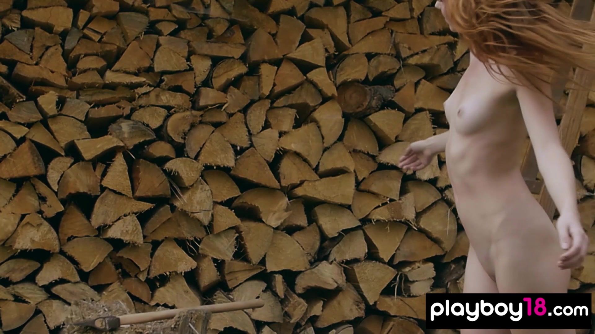 Redhead Russian naked babe chopping wood