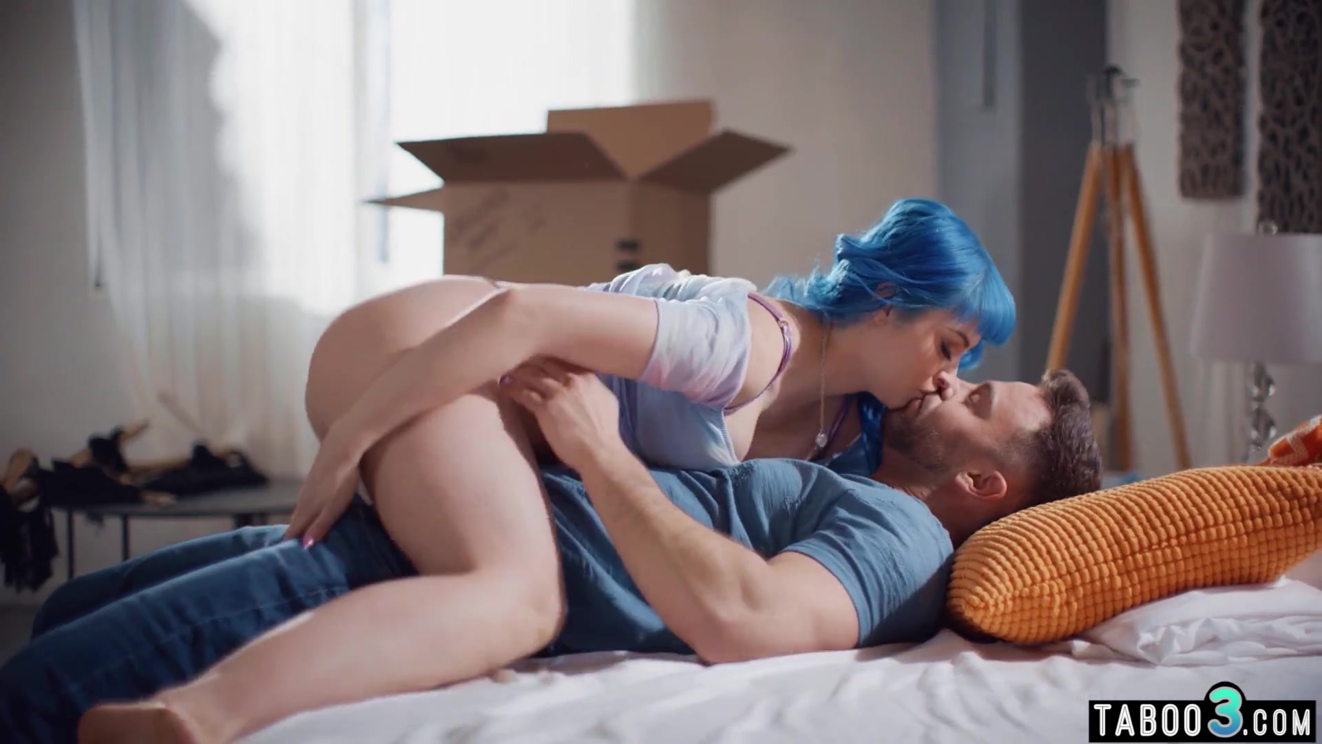 Angry blue haired slut Jewelz Blu with big boobs finds out that her BF is a cheater so when a guy comes to buy their bed she help him to test it She takes his big cock and after a blowjob she lets him to fuck her shaved pussy hard