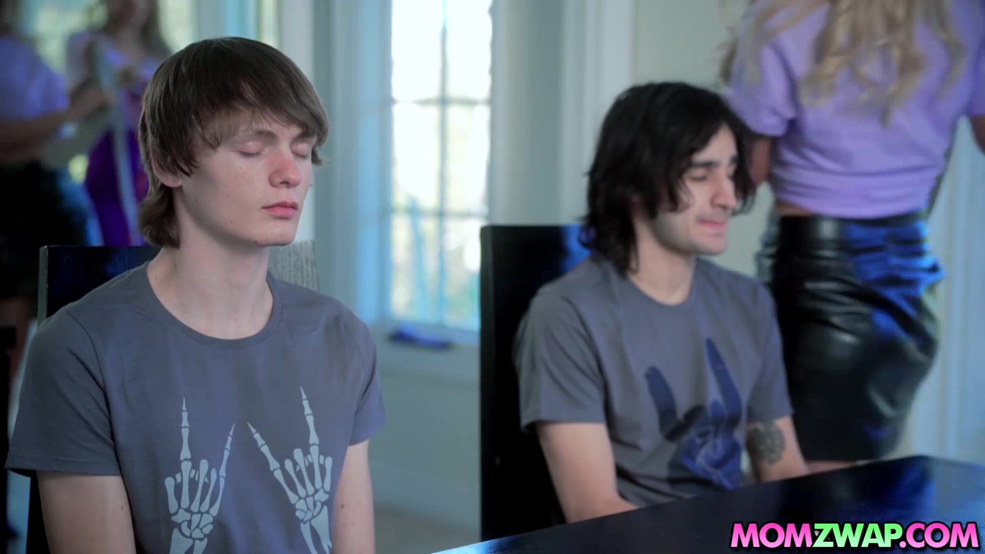 Kenzie Love and Alexis Malone want to get impregnated and the best way to do it is to get fucked by Elias and Spikey who are off to college. The horny milfs make a plan by blindfolding them and offering their pussies.