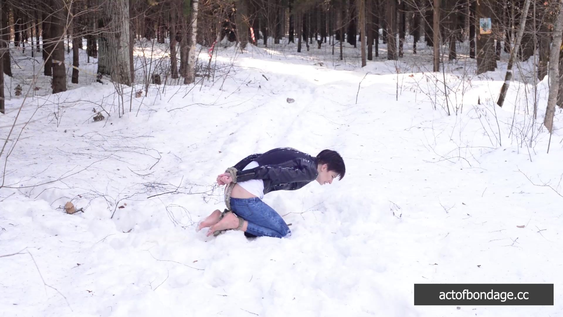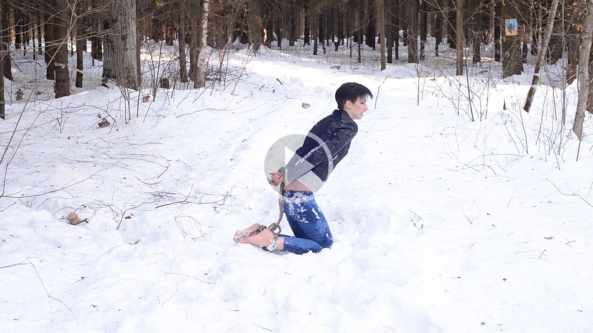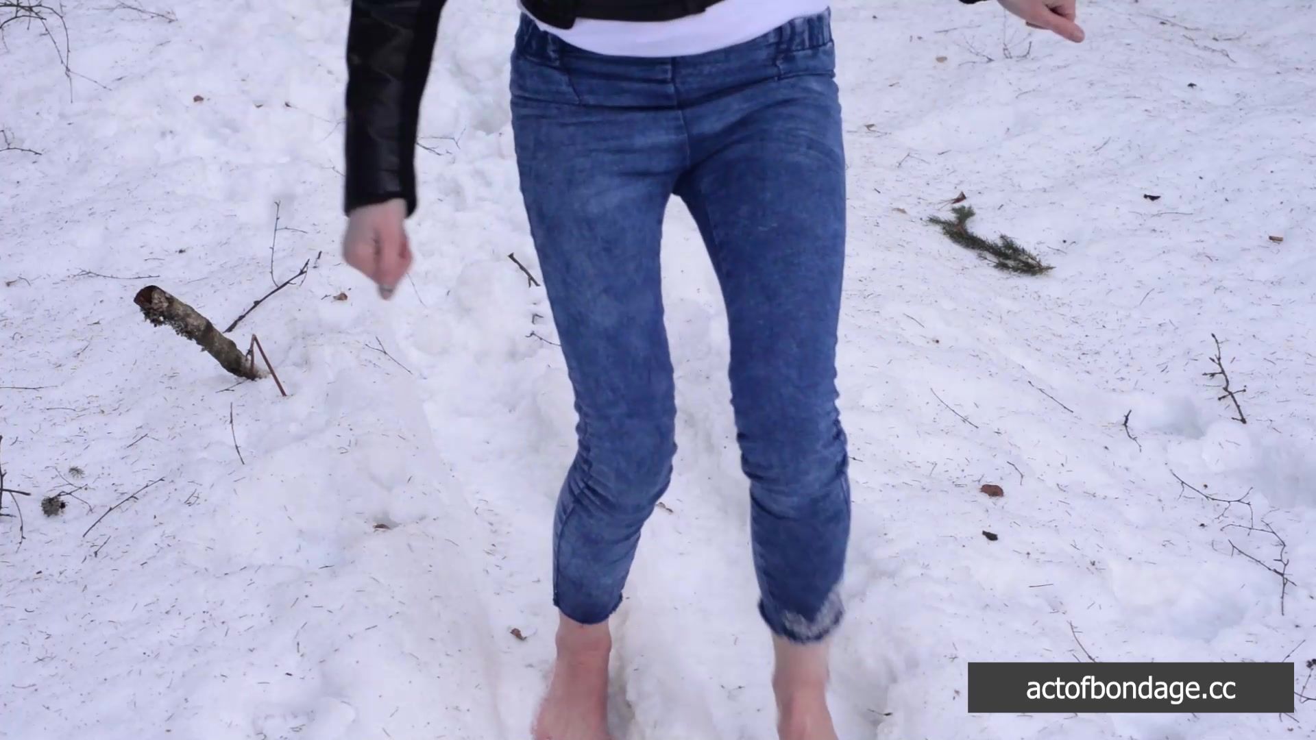 Naked barefoot Claudia tied up in the snow