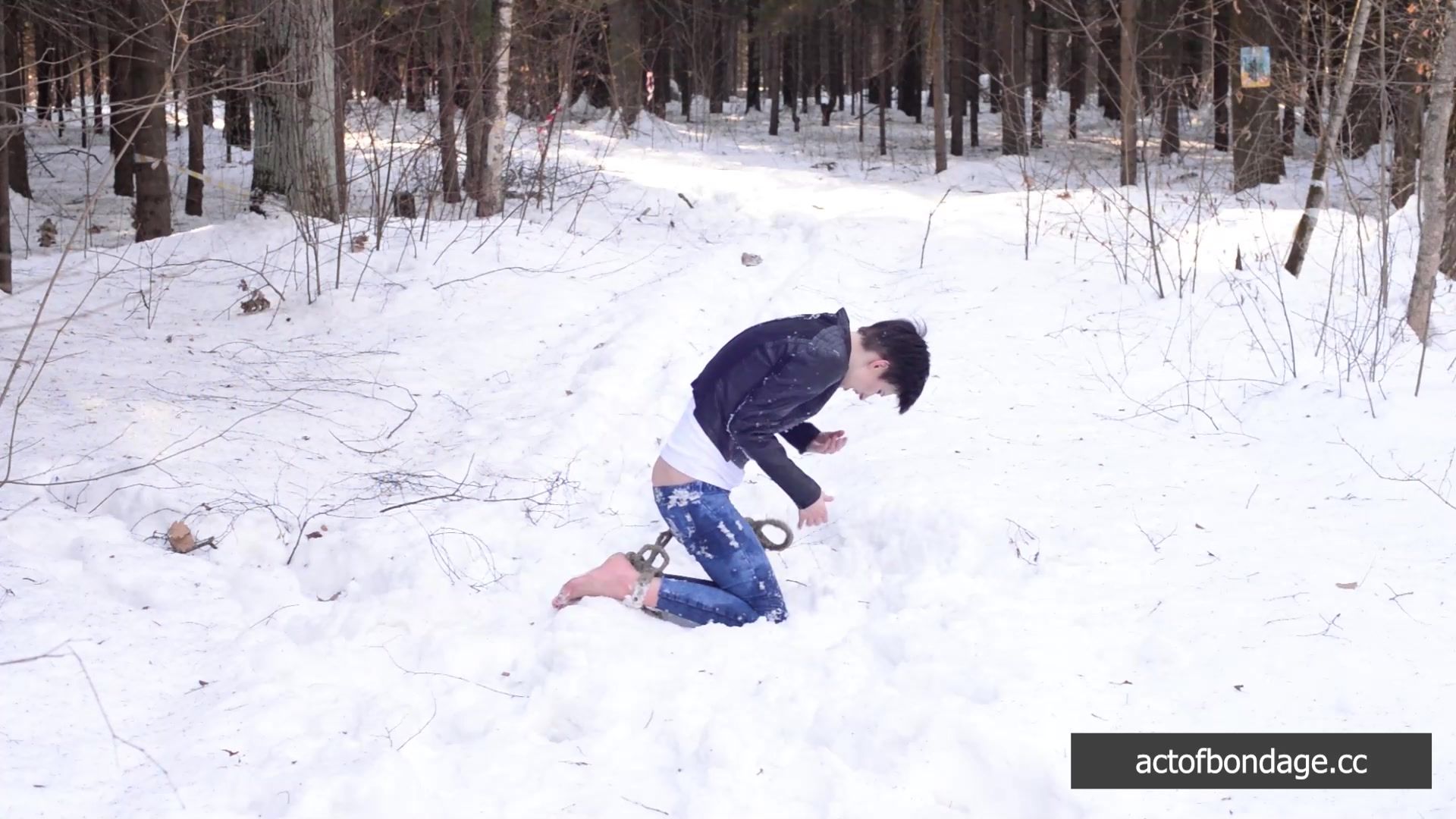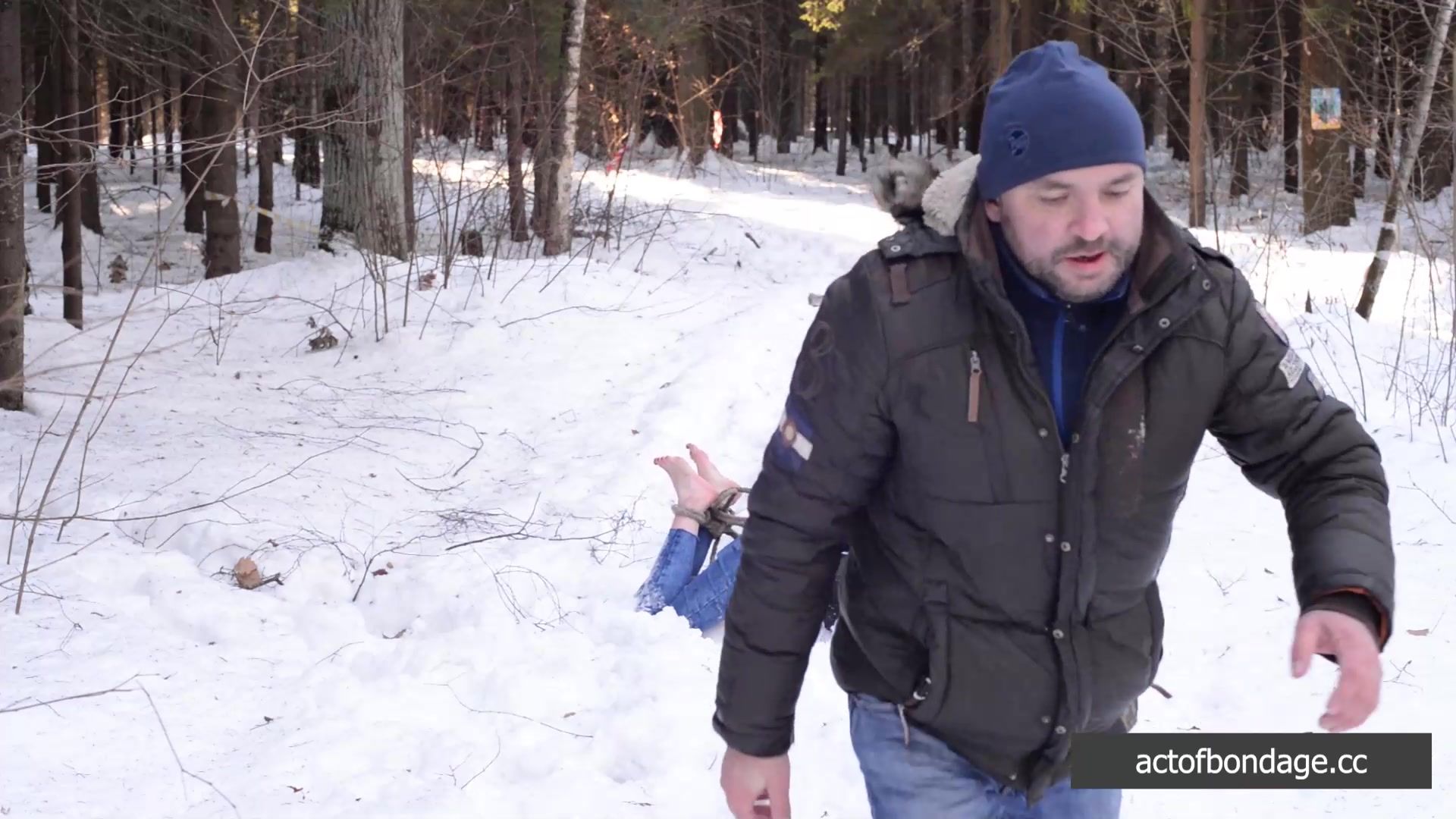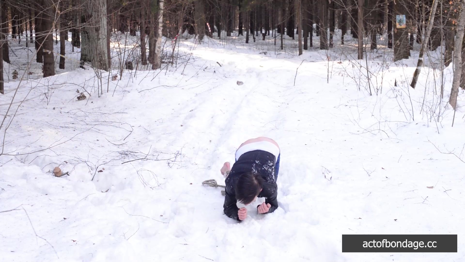 Naked barefoot Claudia tied up in the snow