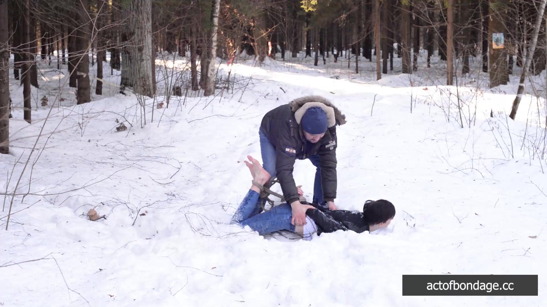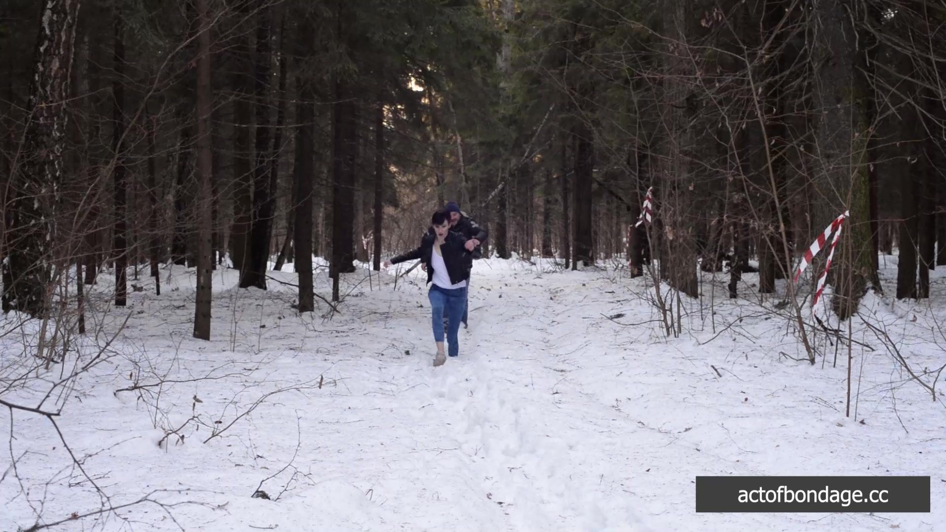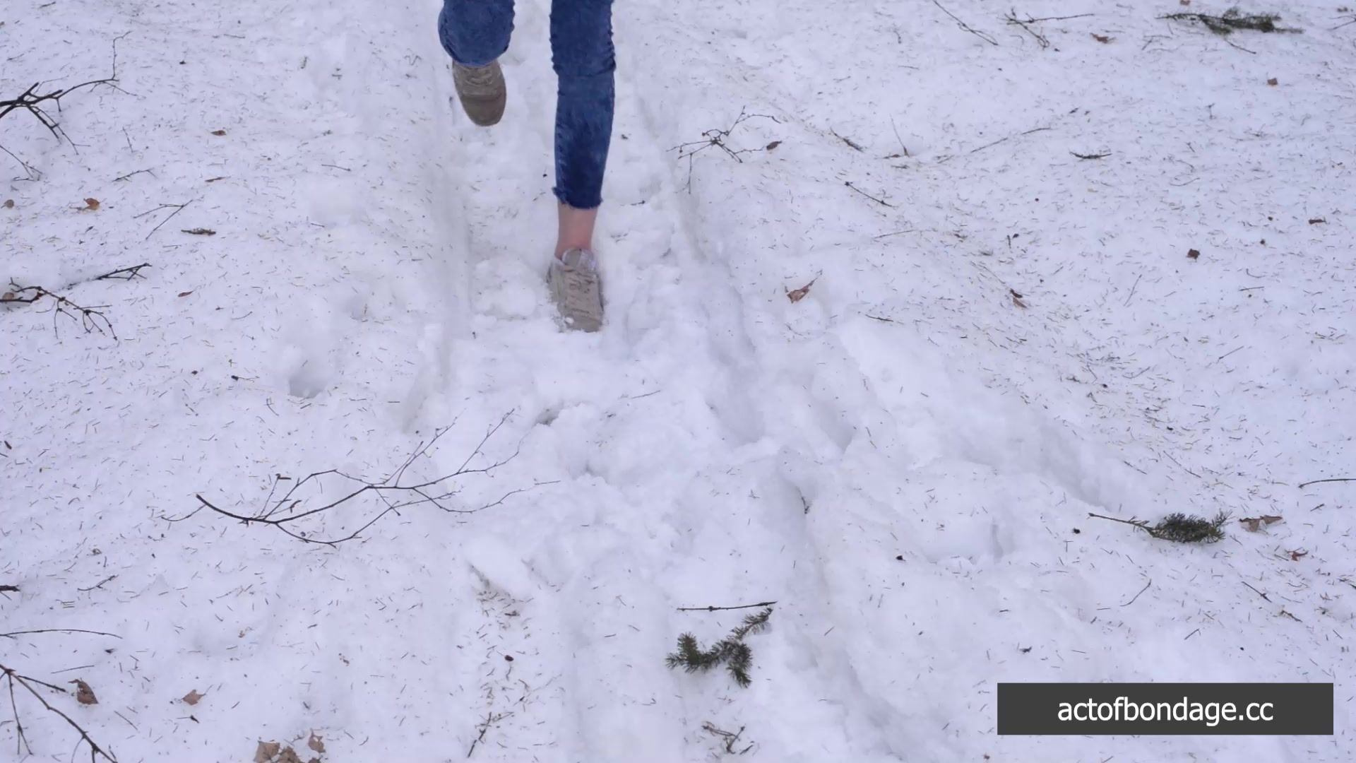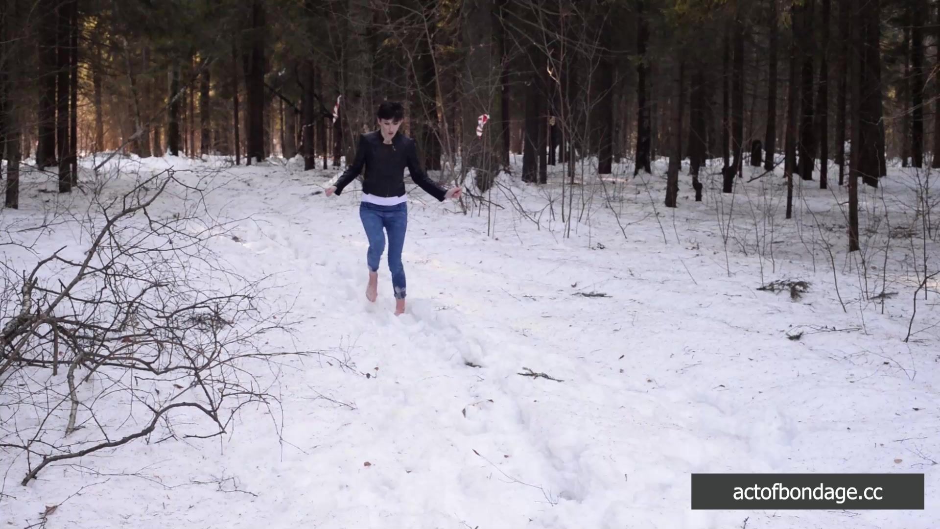 Claudia walked in the forest. Suddenly someone caught her and tied her up. She lost her sneakers and head to walk barefoot in the snow.
