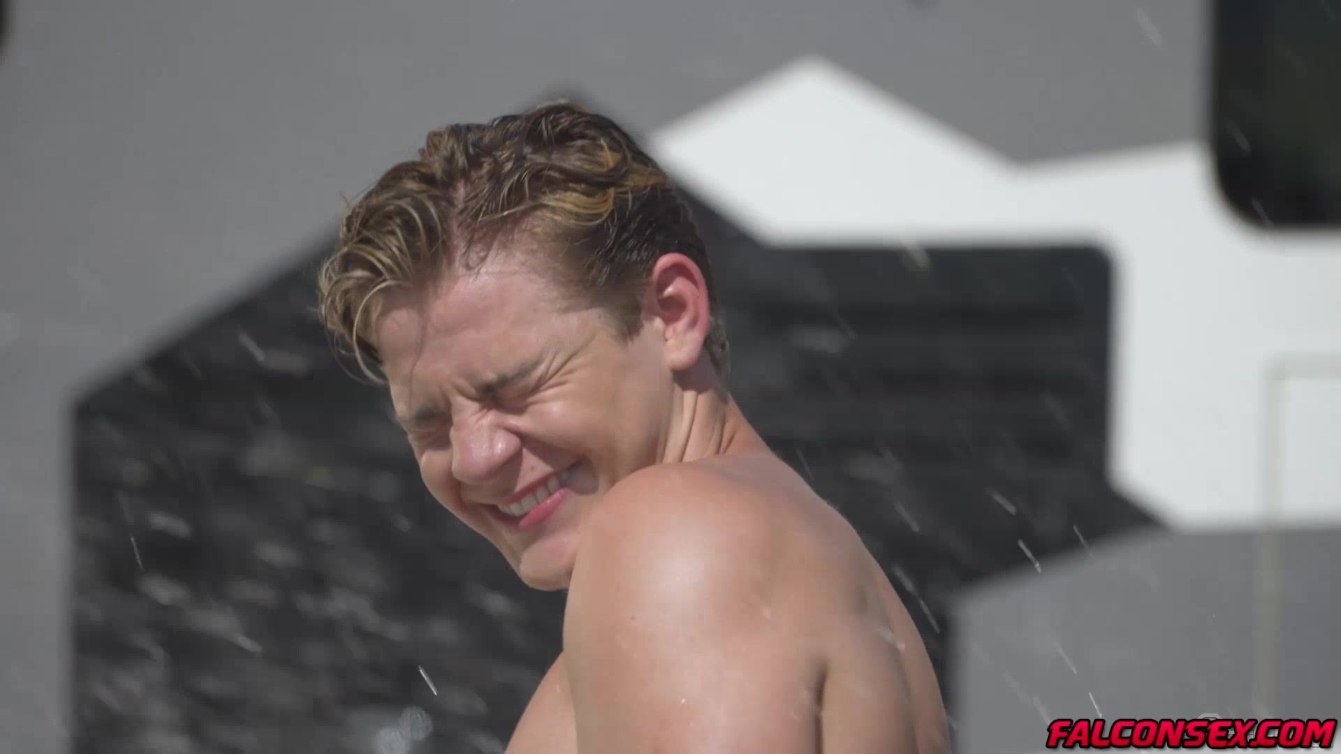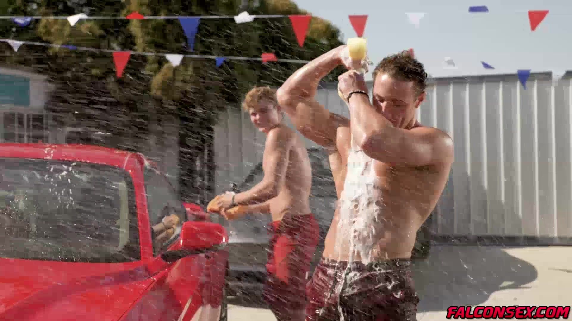 Trevor Brooks and Oliver Marks along with a crew of shirtless studs have come together to host a car wash. Trevor and Oliver sneak behind a building Oliver drops on his knees, pulls down Trevor's shorts and sucks him off. Trevor rims his ass and begins pumping him full of his bareback cock.