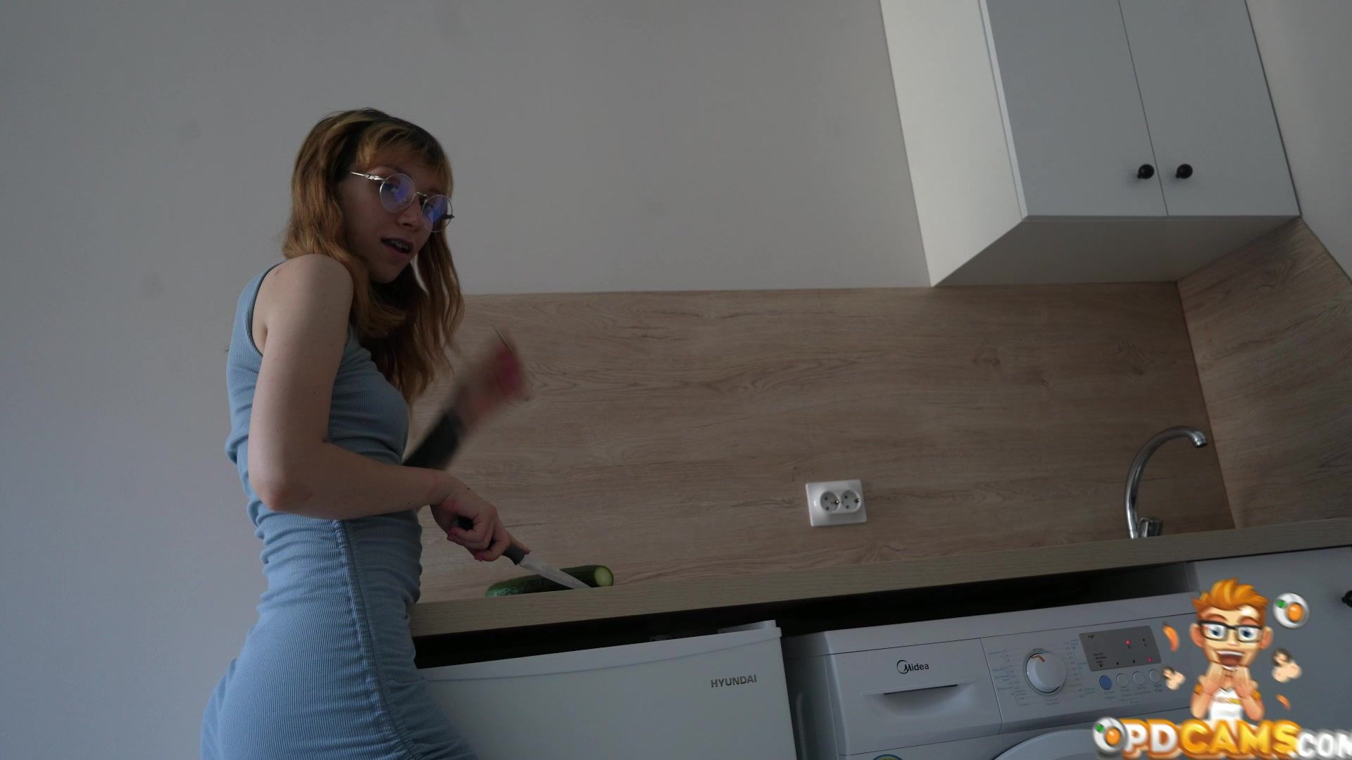 Super horny college girl in glasses masturbates on the kitchen counter and reach her orgasm