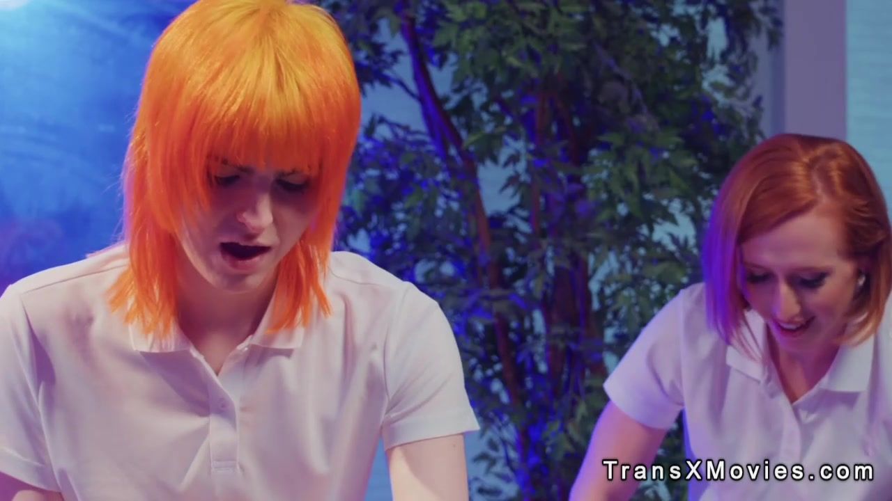Sexy redhead shemale couple Jean Hollywood and Shiri Allwood are back at the resort and give hot massage to big tits blonde masseuse Kenzie Anne then fuck her in various positions