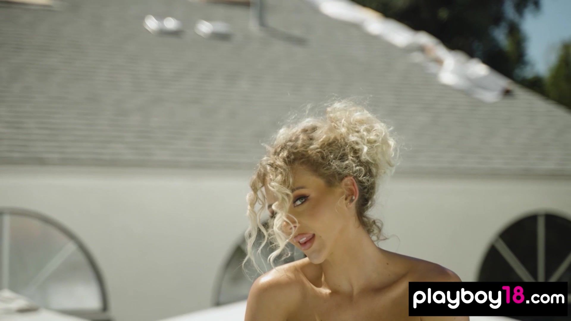 This bombastic blonde babe Sara Ames with big natural tits and pierced nipples loves being naked so she is taking off her sexy bikini by the pool outdoor then the nude beauty is posing to show her amazing body for Playboy