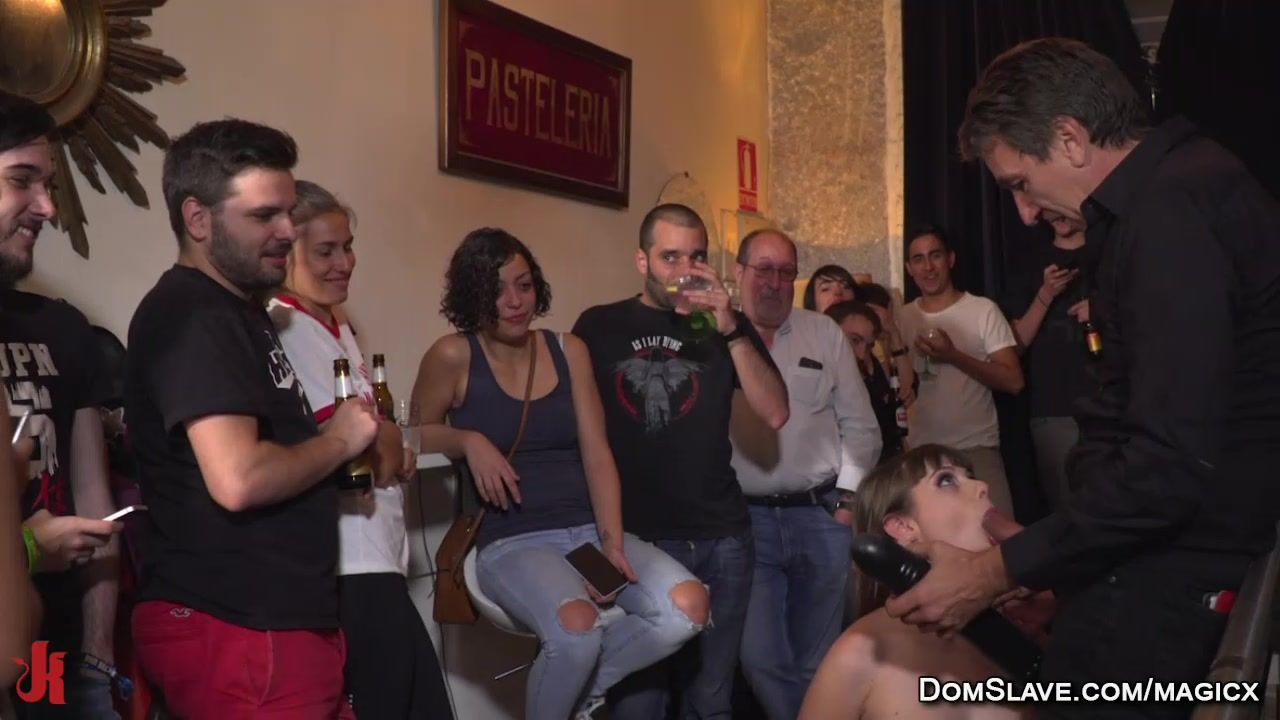Master Steve Holmes takes petite French Parisian babe Luna Rival in public bar where in front of strangers fucks her with big cock in her mouth and wet pussy and lets strangers [censored] and spank her