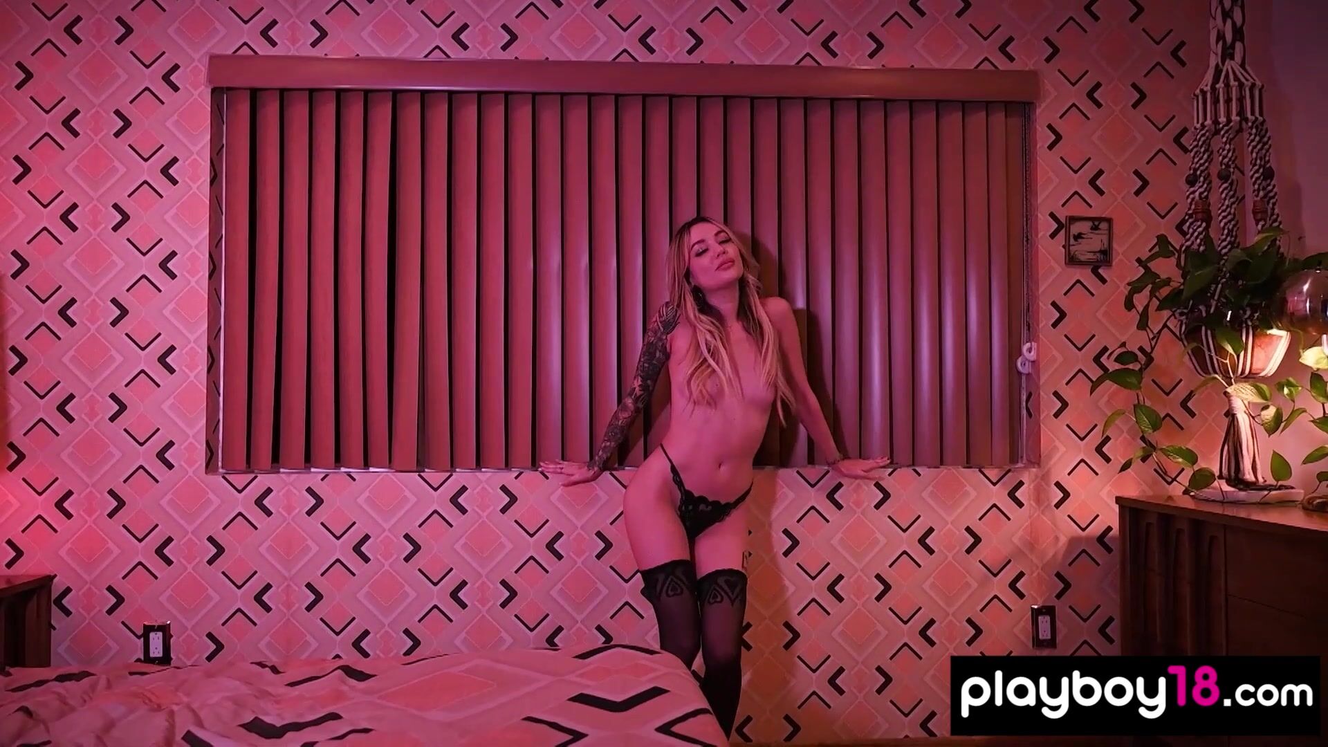 Petite blonde muse Junipr Keiko with small tits making a sexy photoshoot for Playboy in a cheap motel She is taking off her fancy black lingerie and the skinny babe in stockings introduces us her sexy tattoos